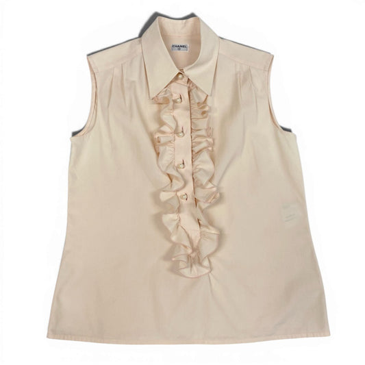 38b9 CHANEL シャネル パールボタン フリルブラウス ノースリブ トップス ベージュ系 シルクコットン レディースta1