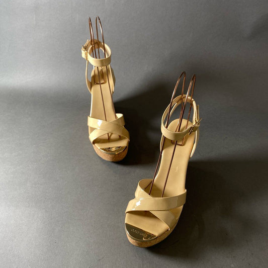 1h4 《美品》 JIMMY CHOO ジミーチュウ ウェッジソール エナメルサンダル 38 ベージュ シューズ イタリア製 メタルプレート