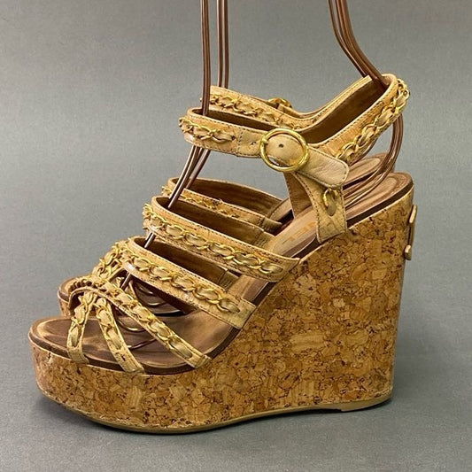 2a6 CHANEL シャネル ココマーク ゴールドチェーン ウェッジソールサンダル 37 ベージュ レザー コルク イタリア製 シューズ パンプス