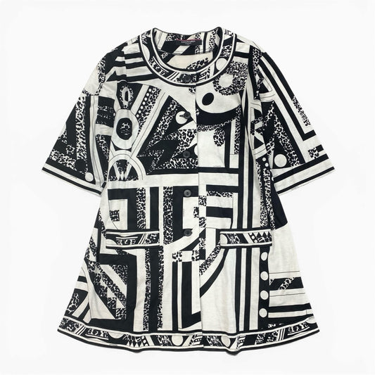 6b12 LEONARD レオナール 半袖カーディガン 美しいプリント チュニック丈 総柄 0359139 Lサイズ ホワイト ブラック コットン100% レディース 女性用u02t
