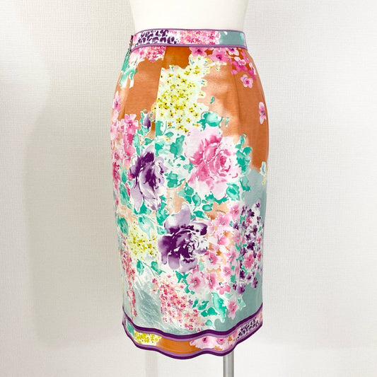 57e25 《美品》 LEONARD レオナール 美しい花柄プリント 花柄スカート 膝丈スカート タイトスカート サイズ76 マルチカラー コットン100% レディース 日本製