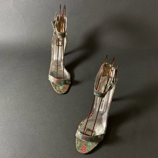 4g17 MANOLO BLAHNIK マノロブラニク ジャガード素材 花柄 ビジュー付き ストラップサンダル サイズ34 1/2 マルチカラー レディース