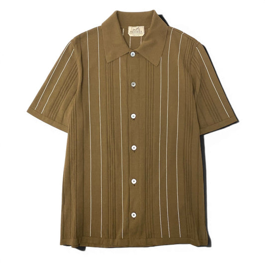 Md22 HERMES エルメス 半袖ニットポロシャツ ボタンダウンカーディガン ストライプ トップス イタリア製 Mサイズ カーキ コットン100% メンズ 男性用t18r