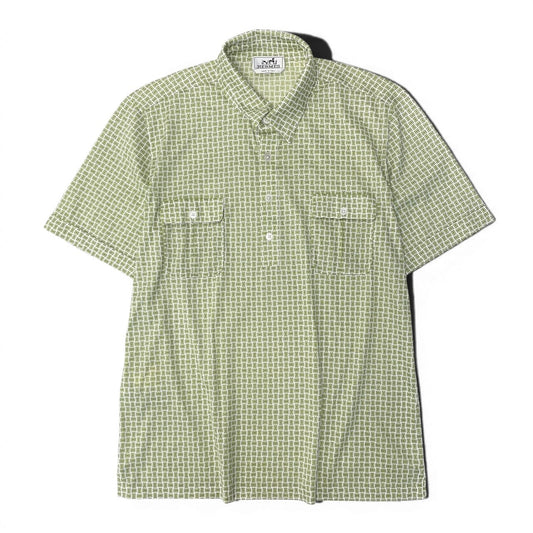 Md22 【新品保管品】HERMES エルメス 半袖ポロシャツ コットンシャツ Hモチーフ総柄 ストレッチ素材 トップス イタリア製 XLサイズ グリーン ホワイト コットン100% メンズ 男性用t18r