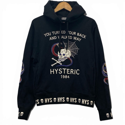 78b12 【美品】HYSTERIC GLAMOUR ヒステリックグラマー プルオーバーフーディー パーカー スカル 刺繍 トップス Mサイズ ブラック コットン100% メンズu02t