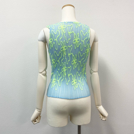 78i11 《極美品》 PLEATS PLEASE プリーツプリーズ イッセイミヤケ フラワープリント メッシュ ノースリーブトップス カットソー 2000ss PP06-JK301 サイズ3 ライトブルー ポリエステル レディースu02t