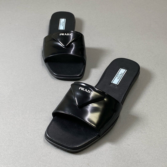 i30 《美品》 PRADA プラダ トライアングルロゴ パデッドナッパレザーサンダル 35 1/2 ブラック ミュール 三角ロゴ シューズt18r