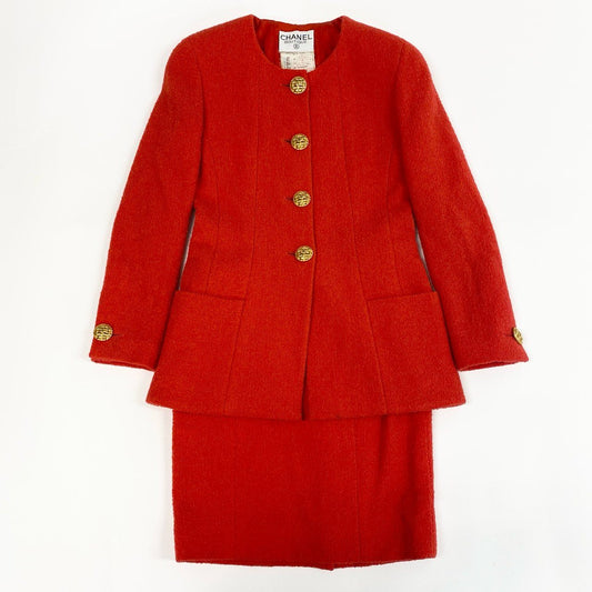 Ca15 【archive】CHANEL ヴィンテージ シャネル 1994年 ランウェイ ツイードジャケット スカート セットアップ ゴールドボタン サイズ36 レッド レディースta1