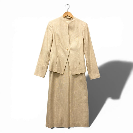 23b17 Paul Stuart ポールスチュアート セットアップ スカートスーツ ノーカラージャケット ミモレ丈 スカート フォーマル セレモニースーツ レディース 女性用 Lサイズ アイボリー系 シルクウール混u02t