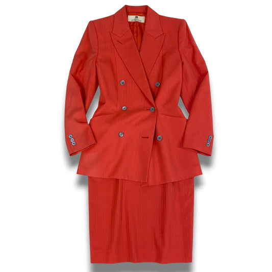 28b20 Vintage GIVENCHY ジバンシー スカートスーツ セットアップ ダブルブレスト 38 オレンジ ストライプ ウール 裏地ロゴu02t