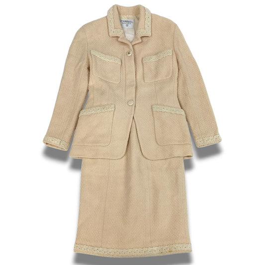 Cc3 CHANEL ヴィンテージ シャネル ココマークボタン ツイードジャケット スカート セットアップ M相当 アイボリー レディース 女性用 スーツta1