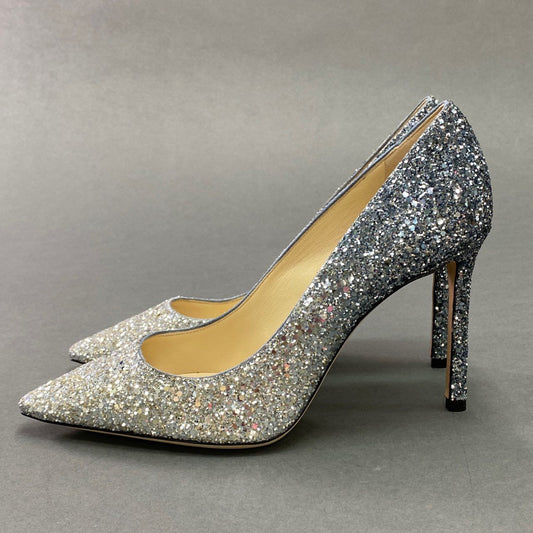 2a9 《極美品》 JIMMY CHOO ジミーチュウ ROMY 100 グラデーショングリッター ヒールパンプス 37 1/2 シルバー ダスクブルー イタリア製 シューズ セレモニー