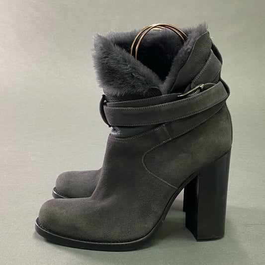 3c18 イタリア製 FABIANA FILIPPI ファビアナフィリッピ メタルビーズ ムートンブーツ ベルト チャンキーヒール スエード 38 グレー スウェード レザー