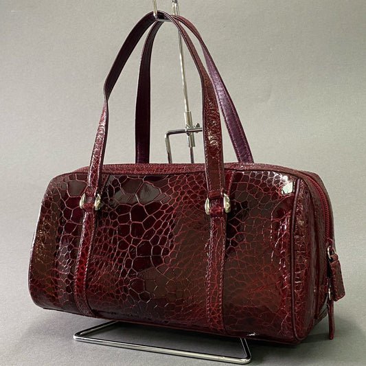 Af6 【JRA認定】 本クロコ クロコダイルレザー ミニボストンバッグ ハンドバッグ エキゾチックレザー ボルドー レザー ワニ革
