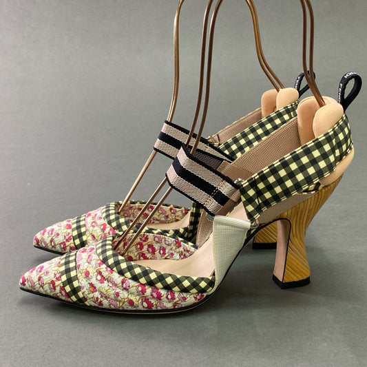 2c25 FENDI フェンディ コリブリ スリングバック パンプス チェック柄 花柄プリント シューズ 37 マルチカラー