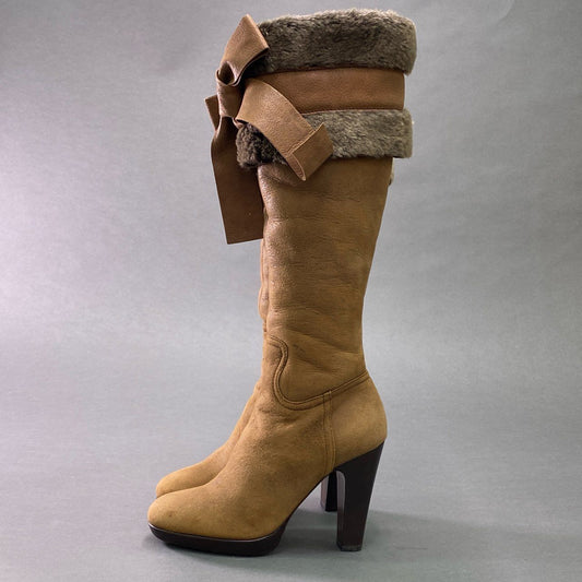 3c18 イタリア製 miu miu ミュウミュウ ボア ロングブーツ リボン シューズ 37 キャメル ブラウン系 スエードレザー