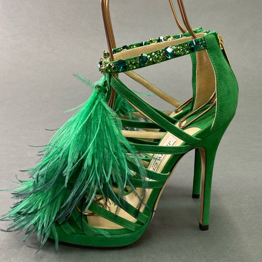 3c18 イタリア製 JIMMY CHOO ジミーチュウ ラインストーン ハイヒールサンダル パンプス シューズ フェザー 37 グリーン スエードレザー