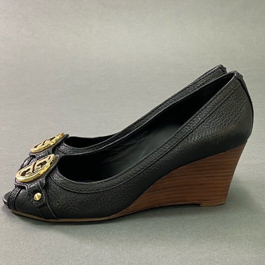 5c18 TORY BURCH トリーバーチ オープントゥ ウェッジソール パンプス ヒール シューズ サンダル 6.5M ブラック レザー