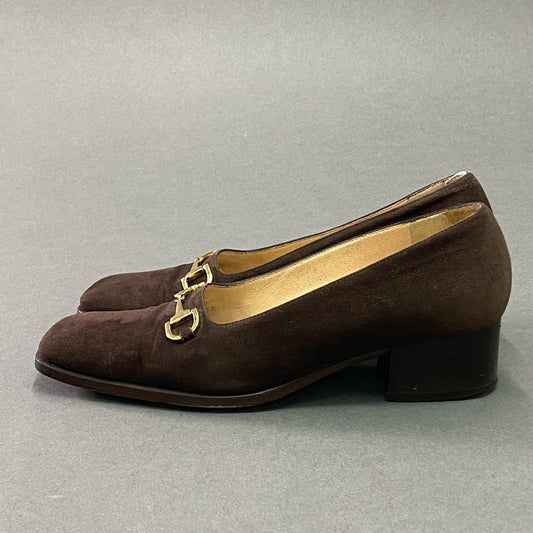 8c25 GUCCI グッチ ホースビット パンプス チャンキーヒール スクエアトゥ イタリア製 36 ブラウン スエード