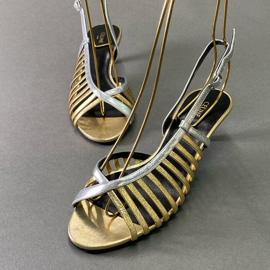 3d5 CELINE セリーヌ スリングバック ローヒール サンダル パンプス グラディエーター 35 ゴールド シルバー