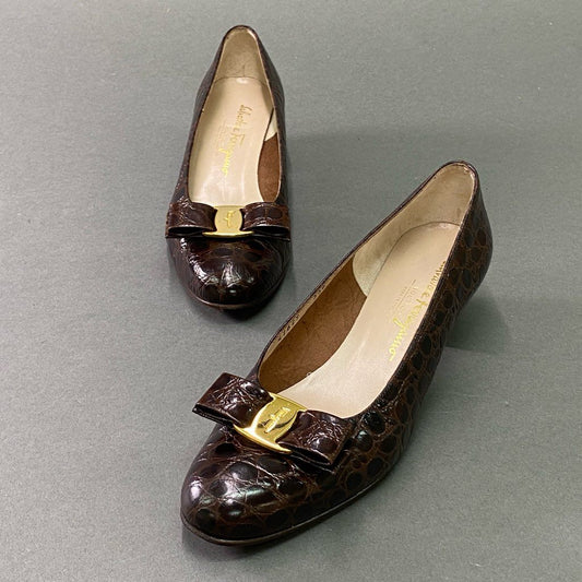 2e10 《美品》 Salvatore Ferragamo サルヴァトーレ フェラガモ VARA ヴァラリボン クロコ パンプス 8 1/2 ブラウン レザー シューズ 革靴 箱付き