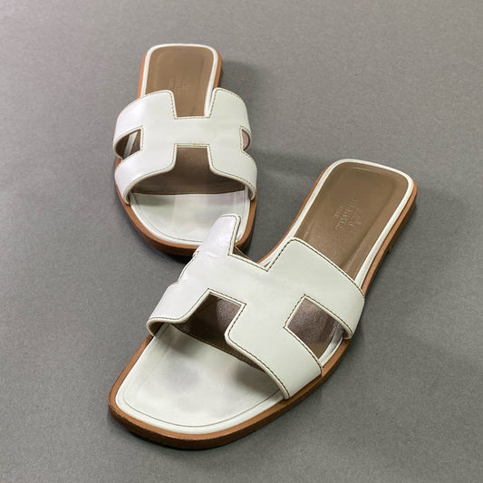 1d11 HERMES エルメス オランH サンダル 37 1/2 / 24.5cm ホワイト レザー フラット Hロゴ イタリア製 シューズ 夏