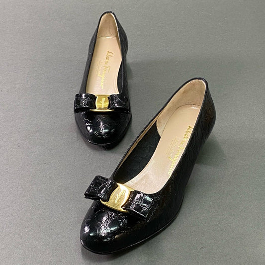 3e10 《美品》 Salvatore Ferragamo サルヴァトーレ フェラガモ VARA ヴァラリボン クロコ パンプス 7 ブラック レザー シューズ 革靴 箱付き
