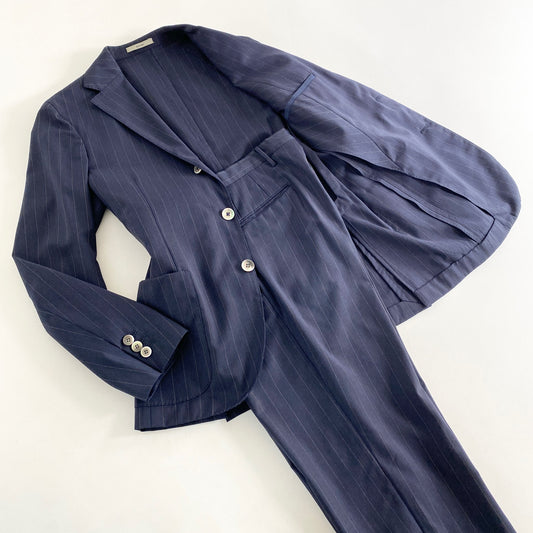 72L5《伊製》BOGLIOLI ボリオリ 3B シングルスーツ セットアップ シェルボタン 46 ネイビー ストライプ メンズ アンコン仕立て