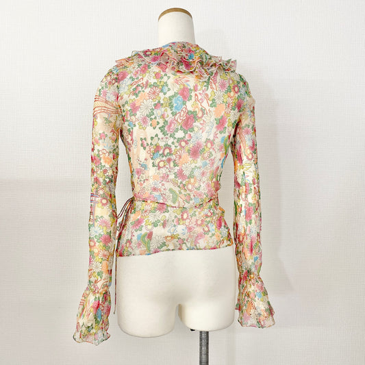 12L2《美品》フランス製 Christian Dior クリスチャン ディオール シルク100% フラワーシアーフリルブラウス 36 ピンク