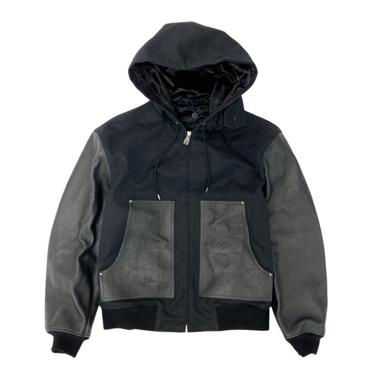 53Ⅼ2 LOUIS VUITTON ルイヴィトン 24SS ダミエ エンボスレザー ミックスレザーフードブルゾン スタジャン サイズ52 ブラック メンズ 男性用 アウター レザージャケットk02i