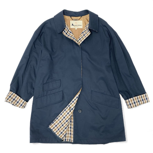 51Ⅼ2《美品》 Aquascutum OF LONDON アクアスキュータム 英国製 ステンカラーコート 切替チェック柄 比翼ボタン レディース 女性用 M ネイビー コットン100%u02t