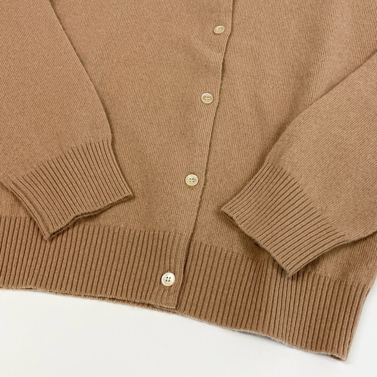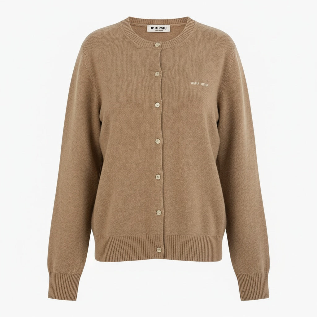 柔らかく上品なベージュカラーが魅力の、**miu miu**のニットカーディガンです。マットで滑らかなカシミヤ素材を使用し、軽やかで肌触りの良い着心地が特徴です。胸元には控えめなロゴ刺繍を配し、シンプルながらブランドらしい洗練された印象に仕上がっています。クルーネックとフロントボタン仕様で、トップス感覚でも羽織りとしても活躍。通勤やきれいめカジュアル、上品な日常コーデに取り入れやすい一着です。
