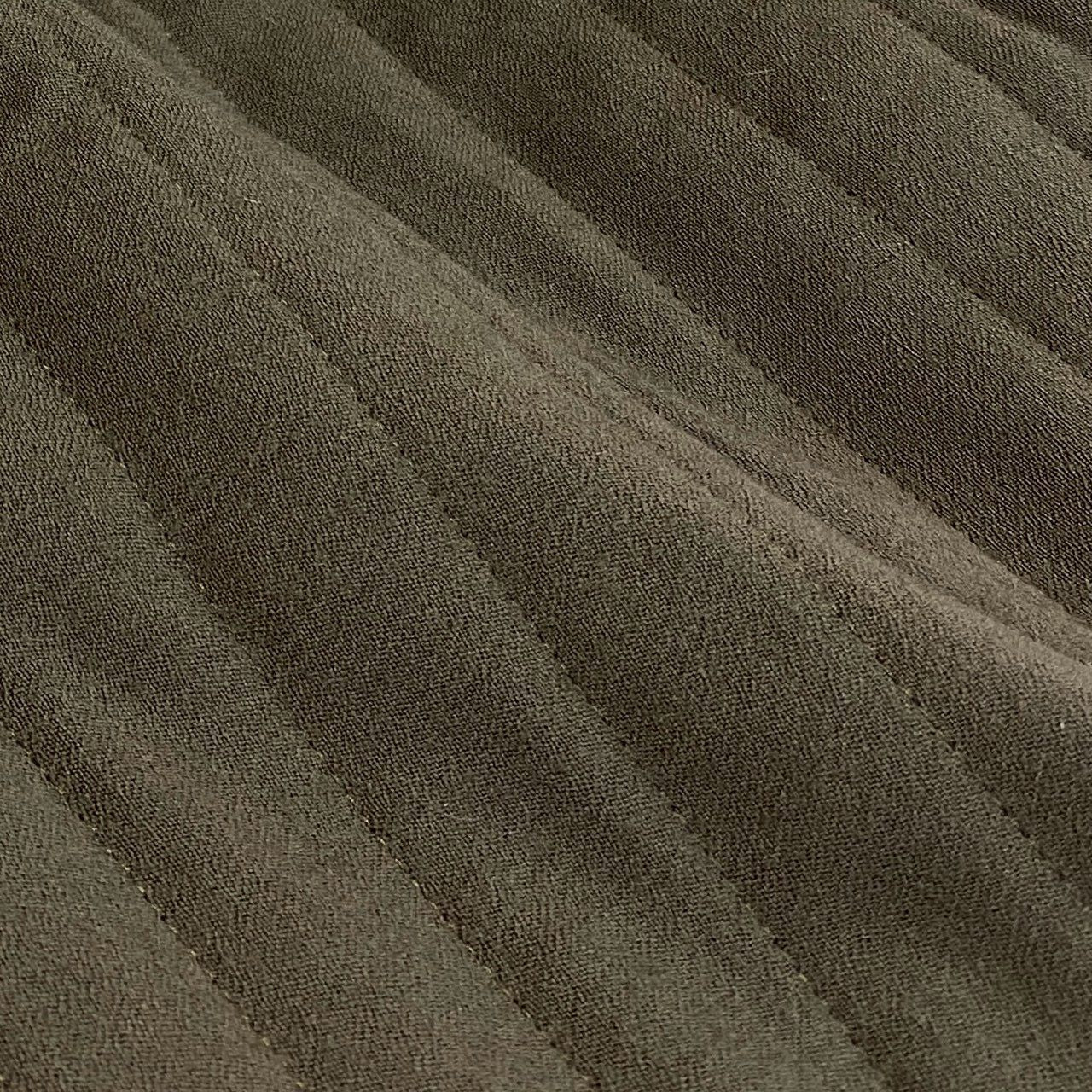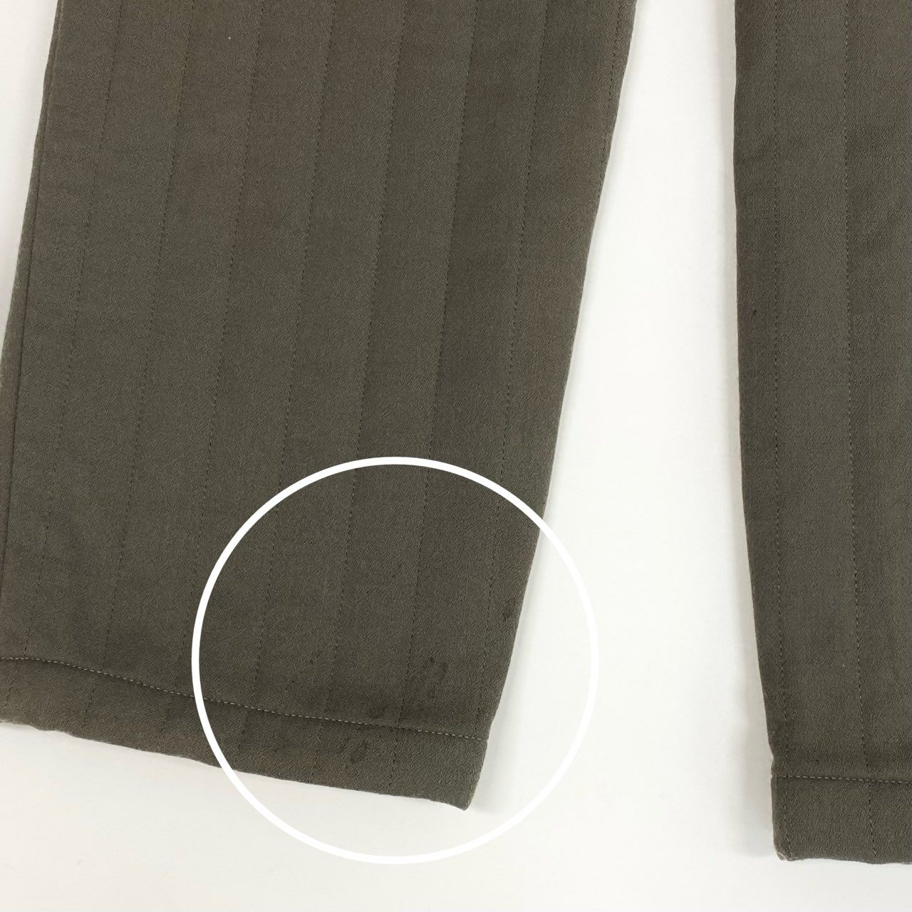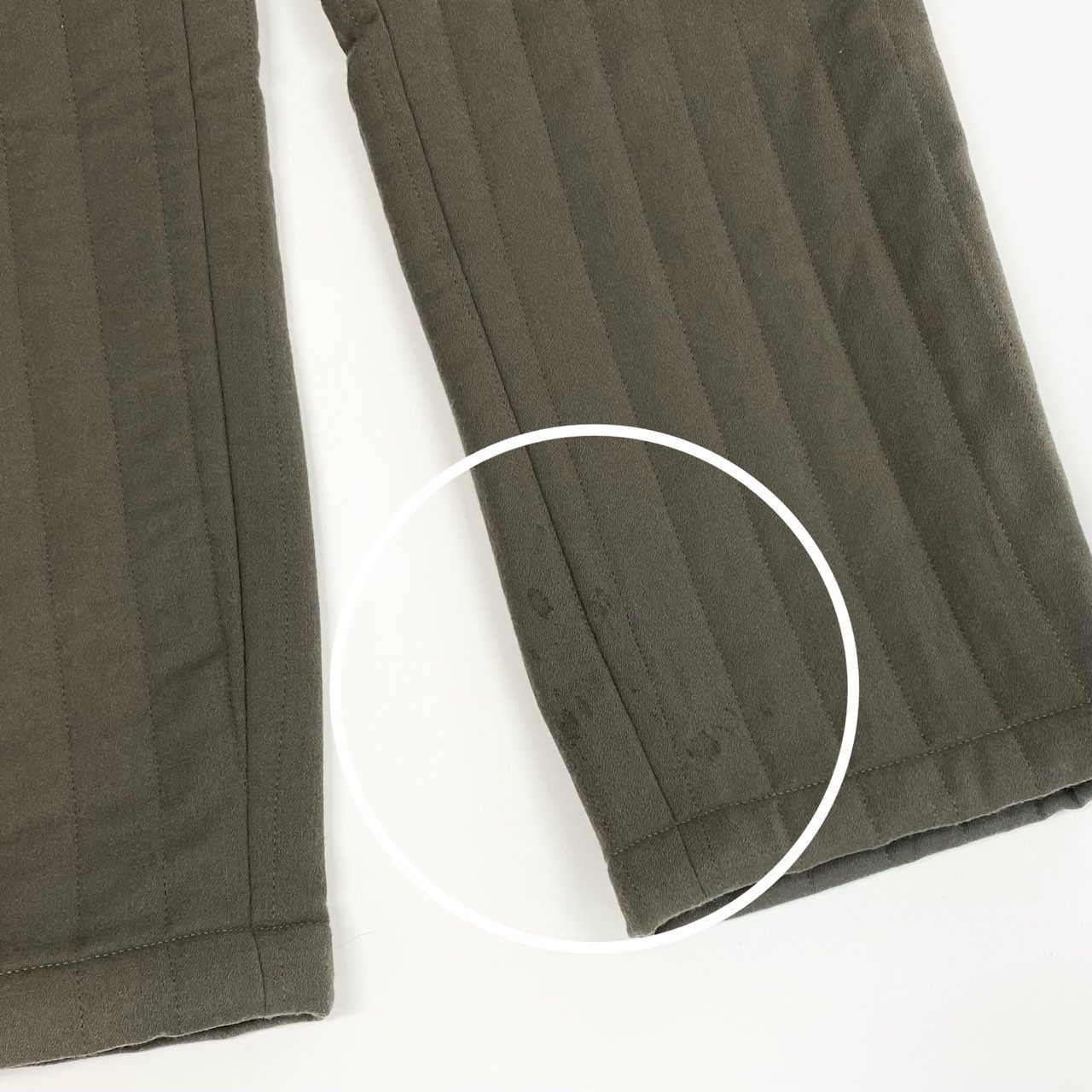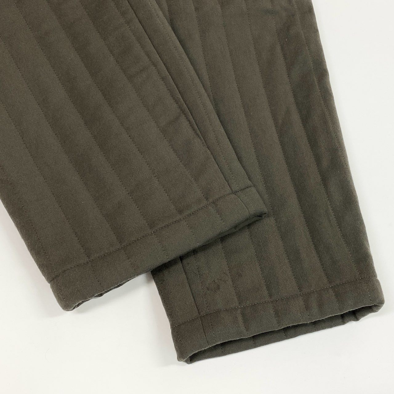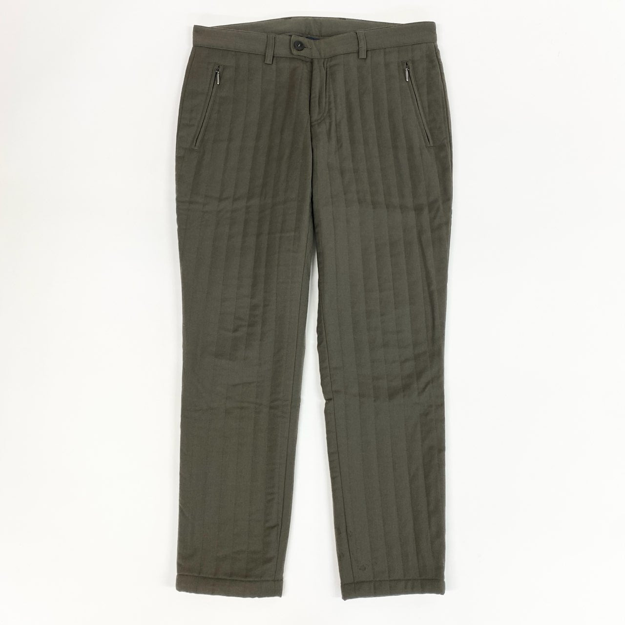 落ち着いたカーキグリーンに縦方向のキルティングステッチを施した、エンポリオアルマーニ「TECNO LINE」のパンツです。素材はウール×ポリエステル混紡で、暖かさと耐久性を兼ね備えた上質な風合い。中綿入りで保温性に優れつつ、マットな質感が上品な印象を与えます。フロントのジップポケットがアクセントとなり、タウンユースから旅行、冬のゴルフなどアクティブシーンにも対応できる万能アイテムです。