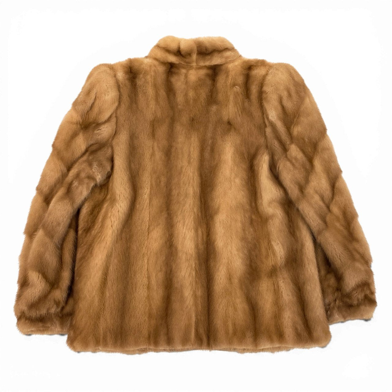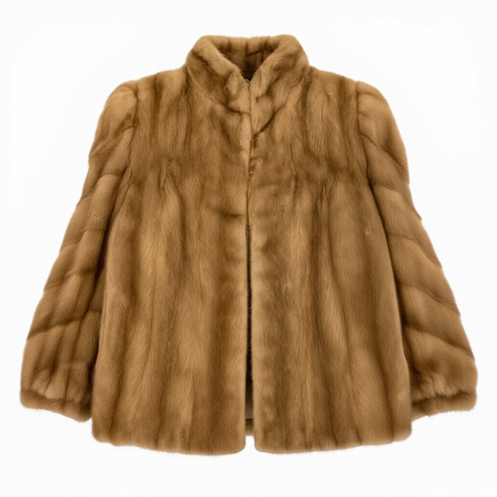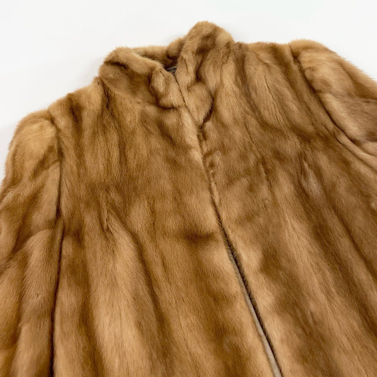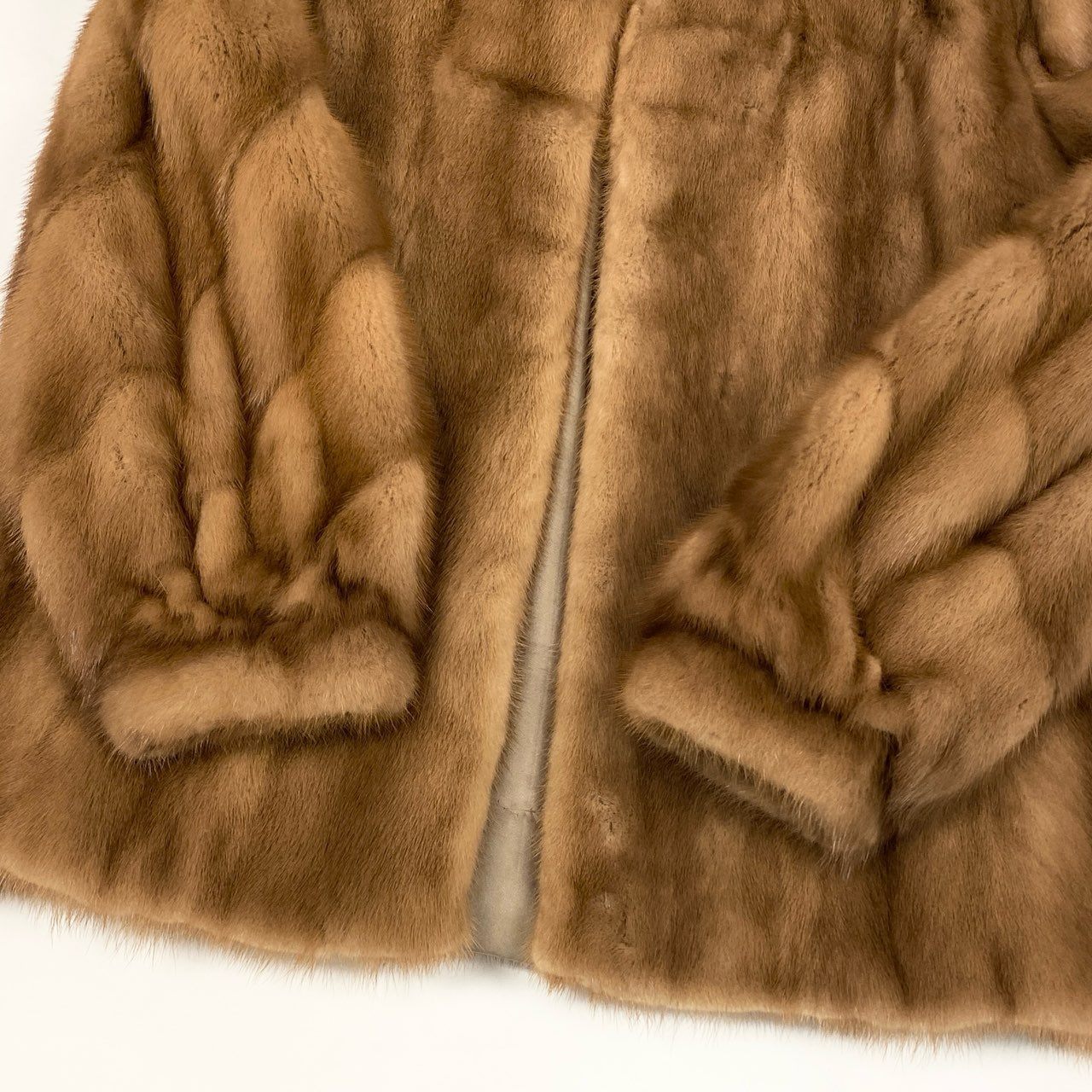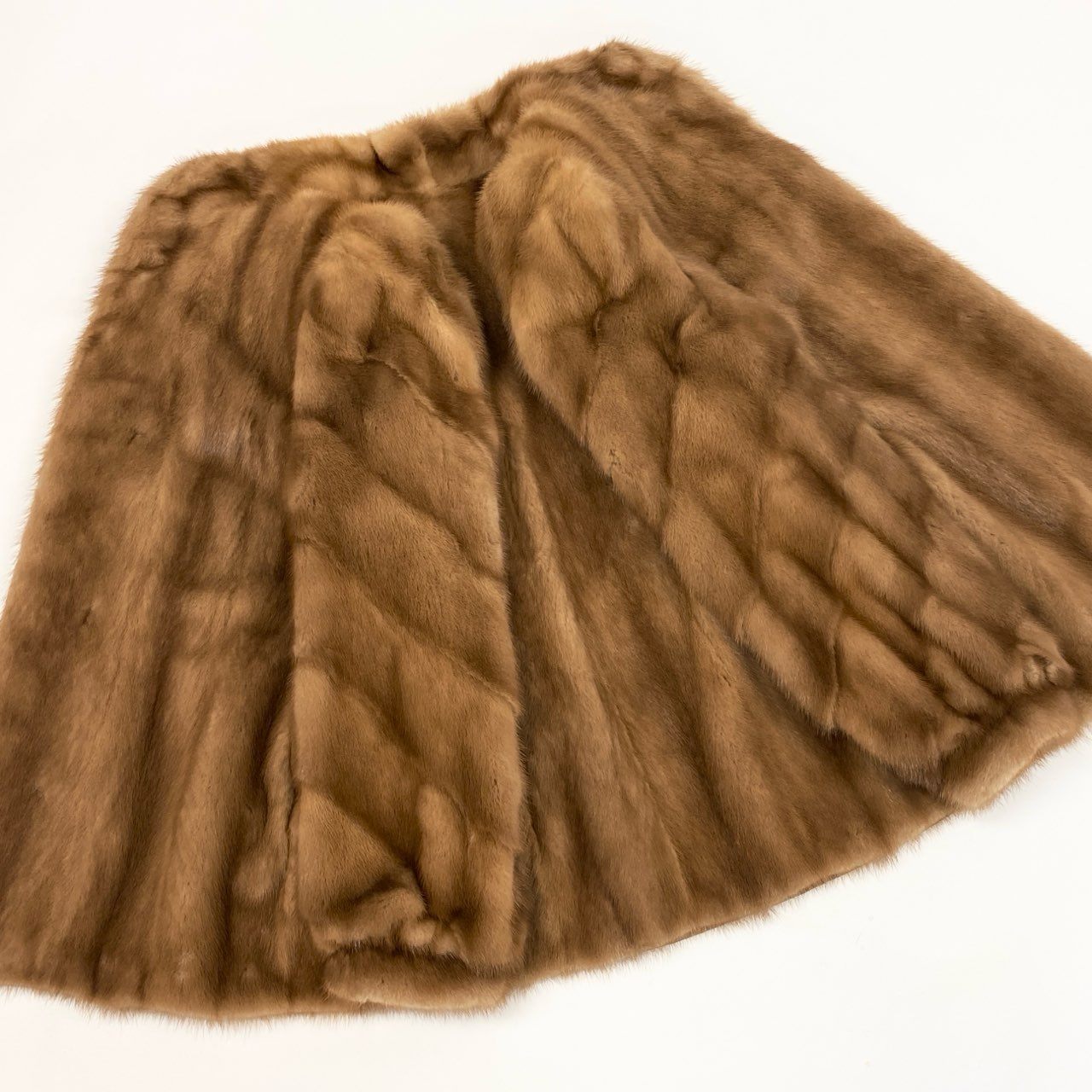 ライトブラウン系カラーが上品な印象のパステルミンク毛皮コートです。 毛足はなめらかで艶があり、斜め段のデザインが立体感と高級感を演出しています。 フロントはすっきりとしたノーカラー寄りのデザインで、幅広いコーディネートに合わせやすい一着です。 冬のお出かけやフォーマル寄りの装いにも対応でき、大人の女性らしい華やかさをプラスしてくれます。