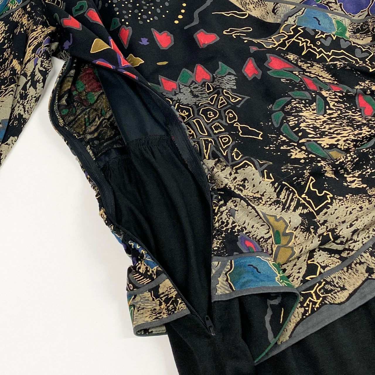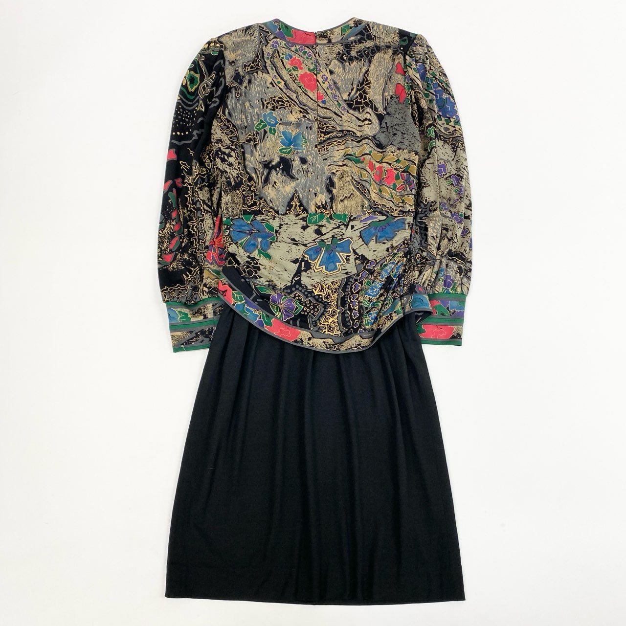 レオナールらしい ブラックベースにマルチカラーの花柄×アートパターン が華やかに映える、ウールシルク素材の上質なドッキングワンピースです。トップス部分はフロントクロスが立体的なドレープを生み、エレガントな雰囲気を演出。スカート部分は柔らかく落ち感のあるブラック生地で、動くたびに綺麗なシルエットが広がります。1枚でコーデが完成する主役級デザインで、食事会・観劇・お出かけなど幅広いシーンで活躍する一着です。