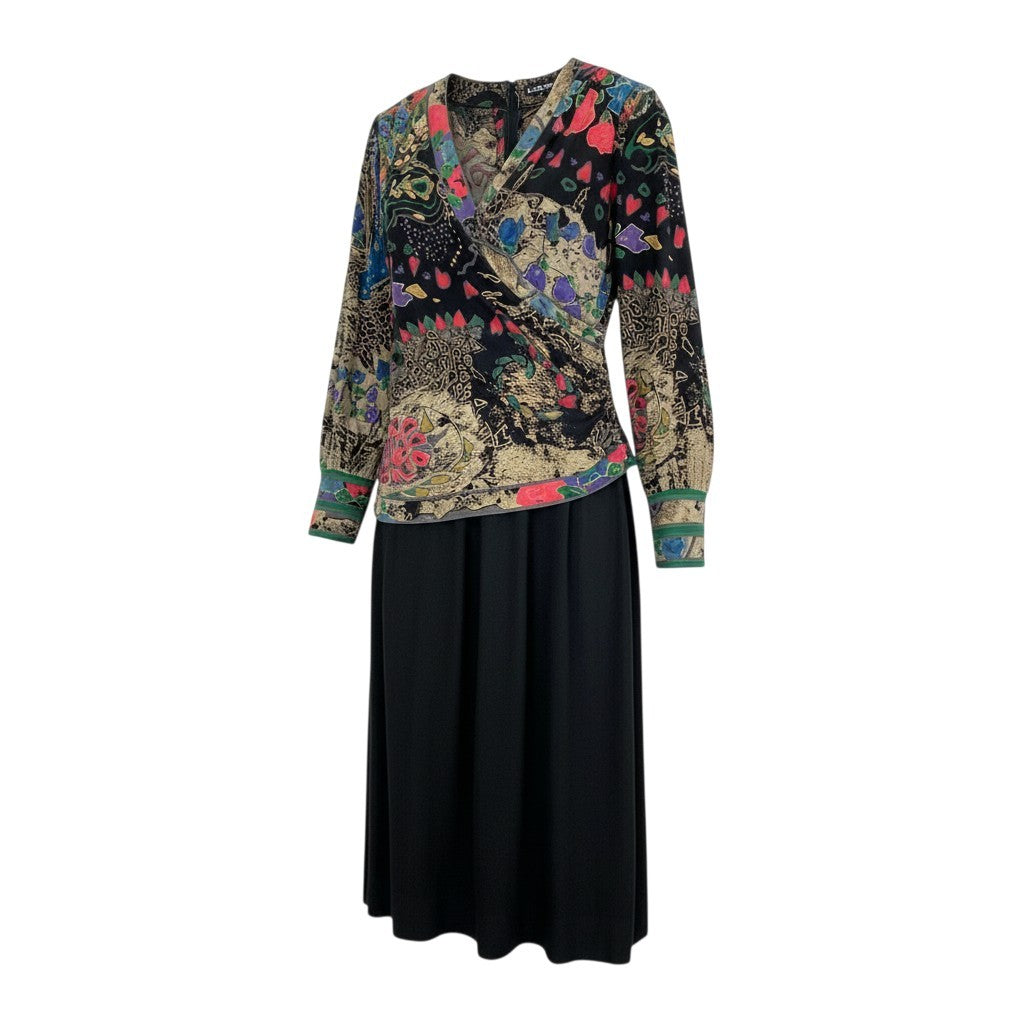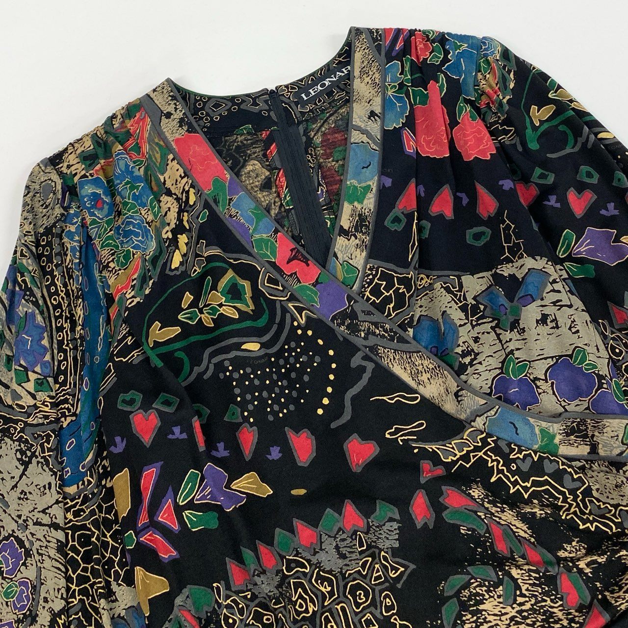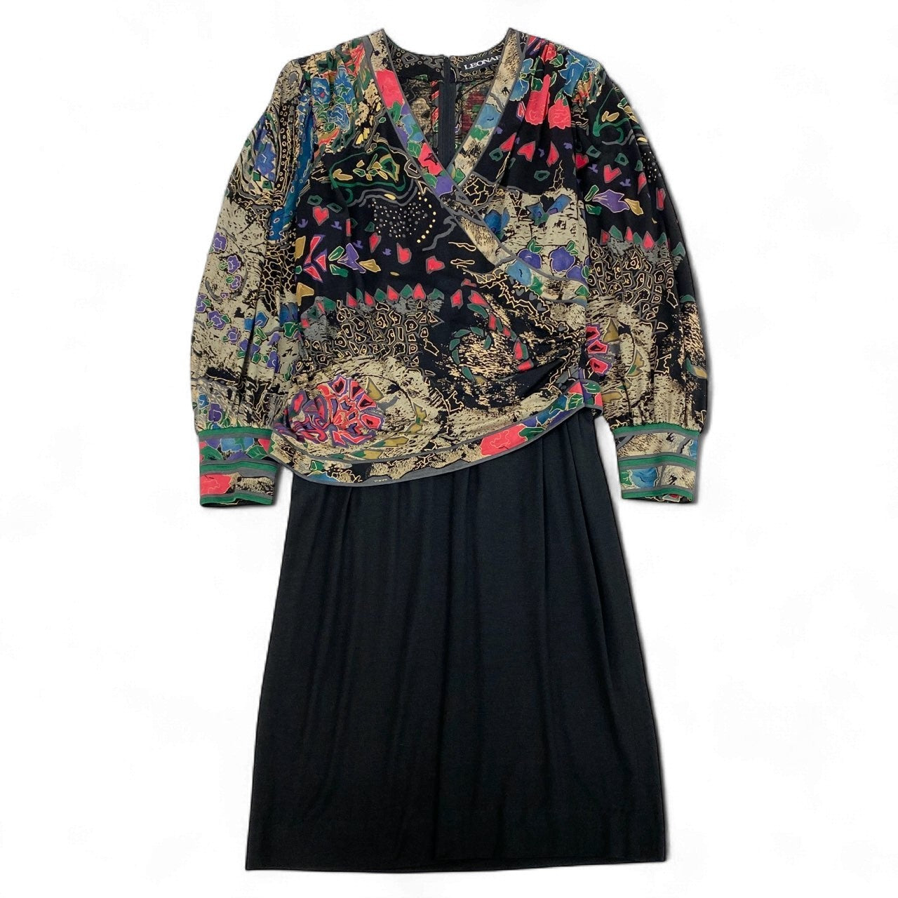 40k26 LEONARD レオナール ドッキングワンピース 長袖ワンピース フロントクロス 花柄モチーフ レディース 女性用 L ブラック ウールシルクo07t