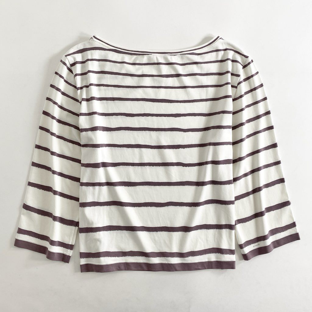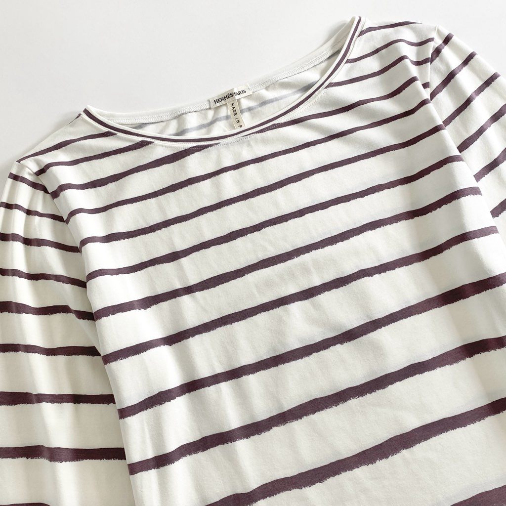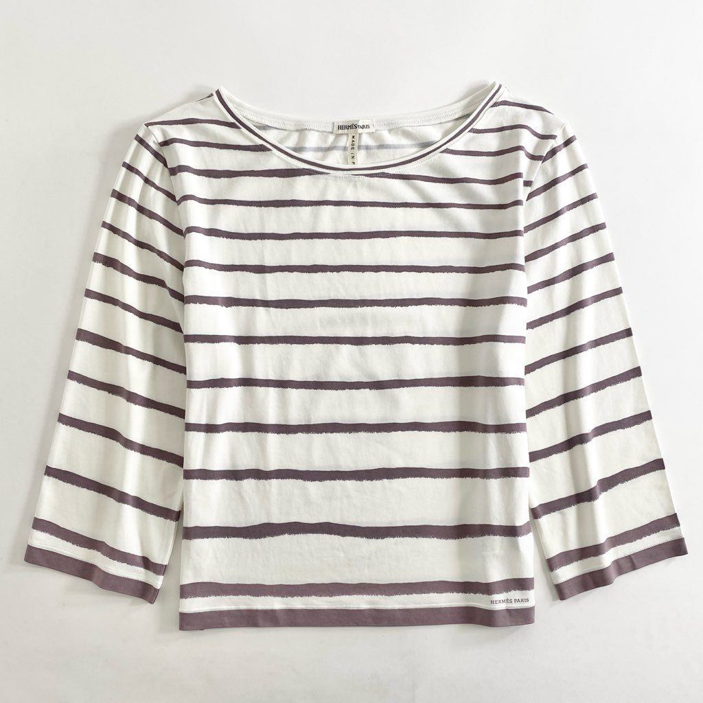 27f20-③ フランス製 HERMES エルメス 裾ロゴプリント 7分袖 ボーダーカットソー トップス 伸縮ストレッチ素材 サイズL パープル系×ホワイト レディース