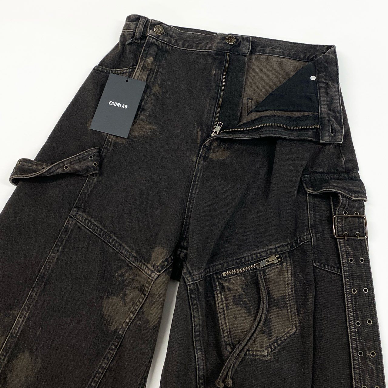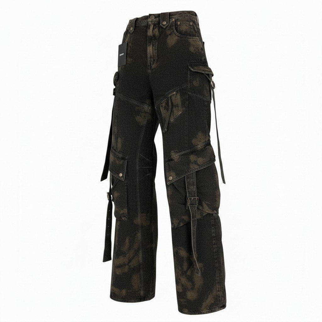 ダークブラウン×ブラックを基調としたムラ染め風のダメージ加工が印象的なカーゴパンツです。マットなコットン素材に、立体ポケットやストラップ、メタルパーツ、裾ジップなどのディテールがアクセントになっています。ワイドかつフレア感のあるシルエットがモードな存在感を演出し、コーディネートの主役になる一本です。シンプルなトップスと合わせるだけでストリート×ハイエンドなスタイルが完成するデザイン性の高いアイテムです。