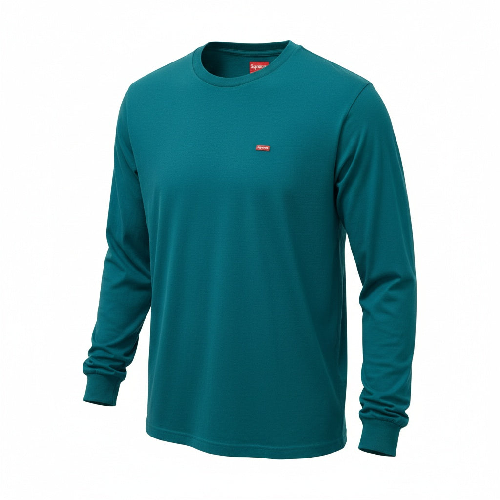 ディープティール(青みのあるグリーン)カラーが印象的なロングスリーブTシャツです。 無地ベースに胸元の小さなレッドロゴパッチがアクセントとなったミニマルデザイン。 マットなコットン素材で、程よい厚みと柔らかな着心地が魅力です。 ストリートスタイルはもちろん、シンプルコーデの差し色としても活躍する万能アイテムです。