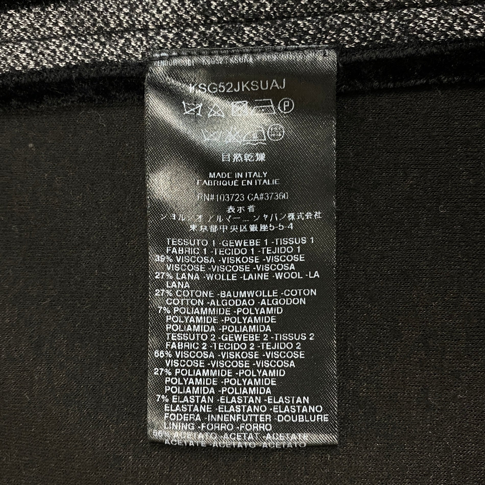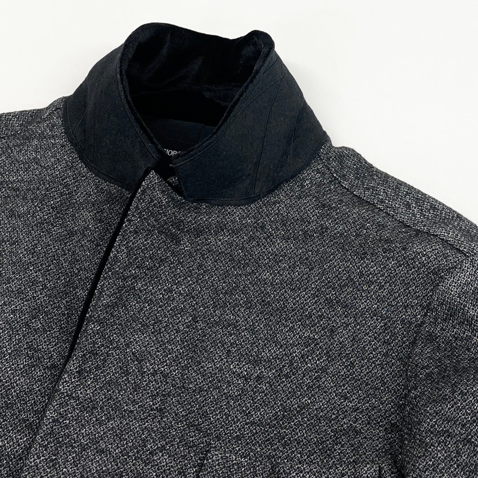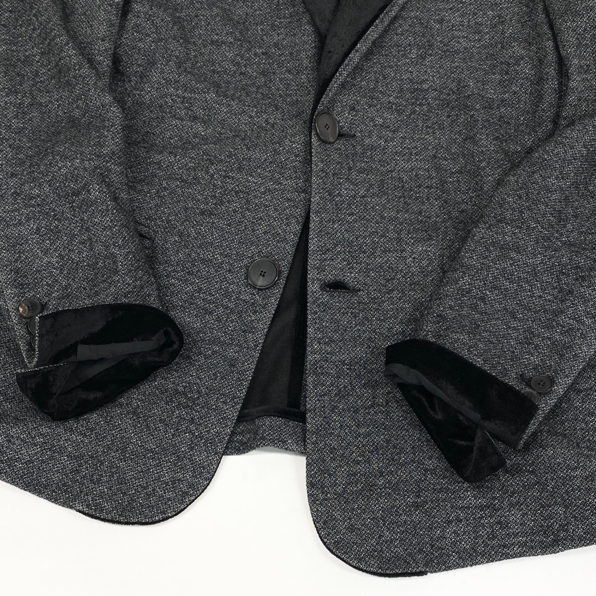 ミックス感のあるグレーカラーをベースに、ラペルと袖口にブラックのベロア切替を施した、GIORGIO ARMANI(ジョルジオ・アルマーニ)のテーラードジャケットです。マットで上質感のあるウール系素材に、ベロアの光沢がアクセントとして映えます。2ボタン仕様と端正なシルエットが、アルマーニらしい洗練された大人の雰囲気を演出します。ドレス寄りのスタイルはもちろん、デニムと合わせた品のあるカジュアルダウンにもおすすめの一着です。