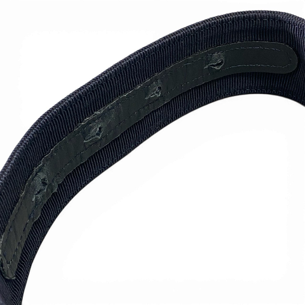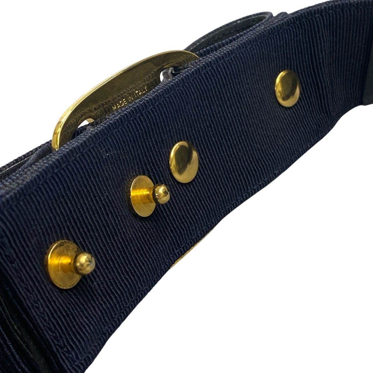 深みのあるミッドナイトネイビーのグログラン調ファブリックに、ゴールドカラーのメタルバックルを組み合わせた上品なベルトです。細かな畝のあるリブ状テクスチャが、落ち着いた中にも高級感を演出します。バックルにはさりげないロゴ刻印が施され、洗練された印象に。**Salvatore Ferragamo**らしいクラシックさで、通勤やフォーマルシーンにも取り入れやすい一本です。
