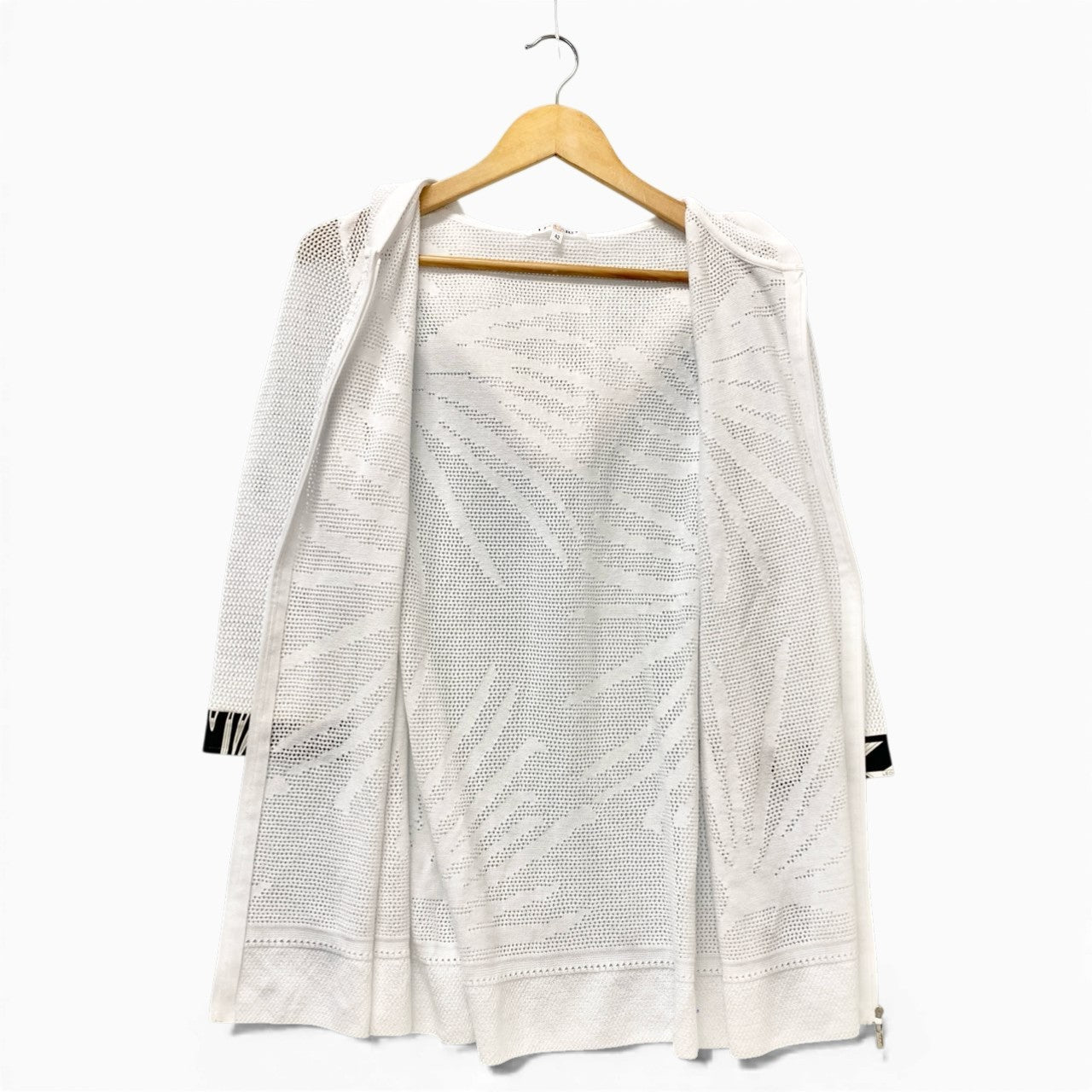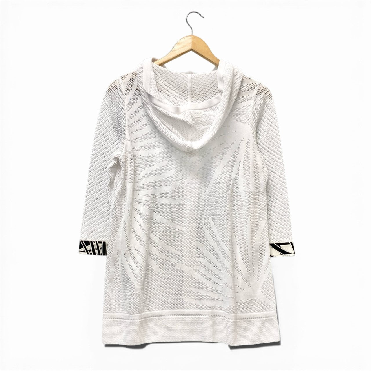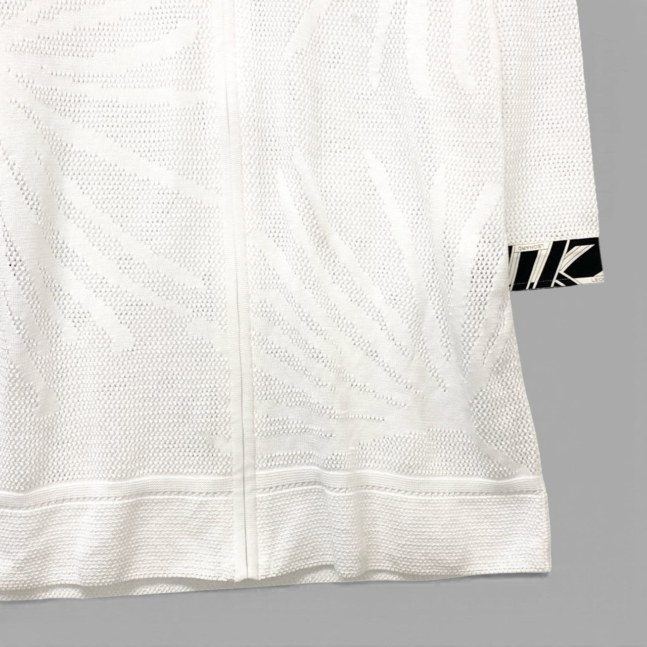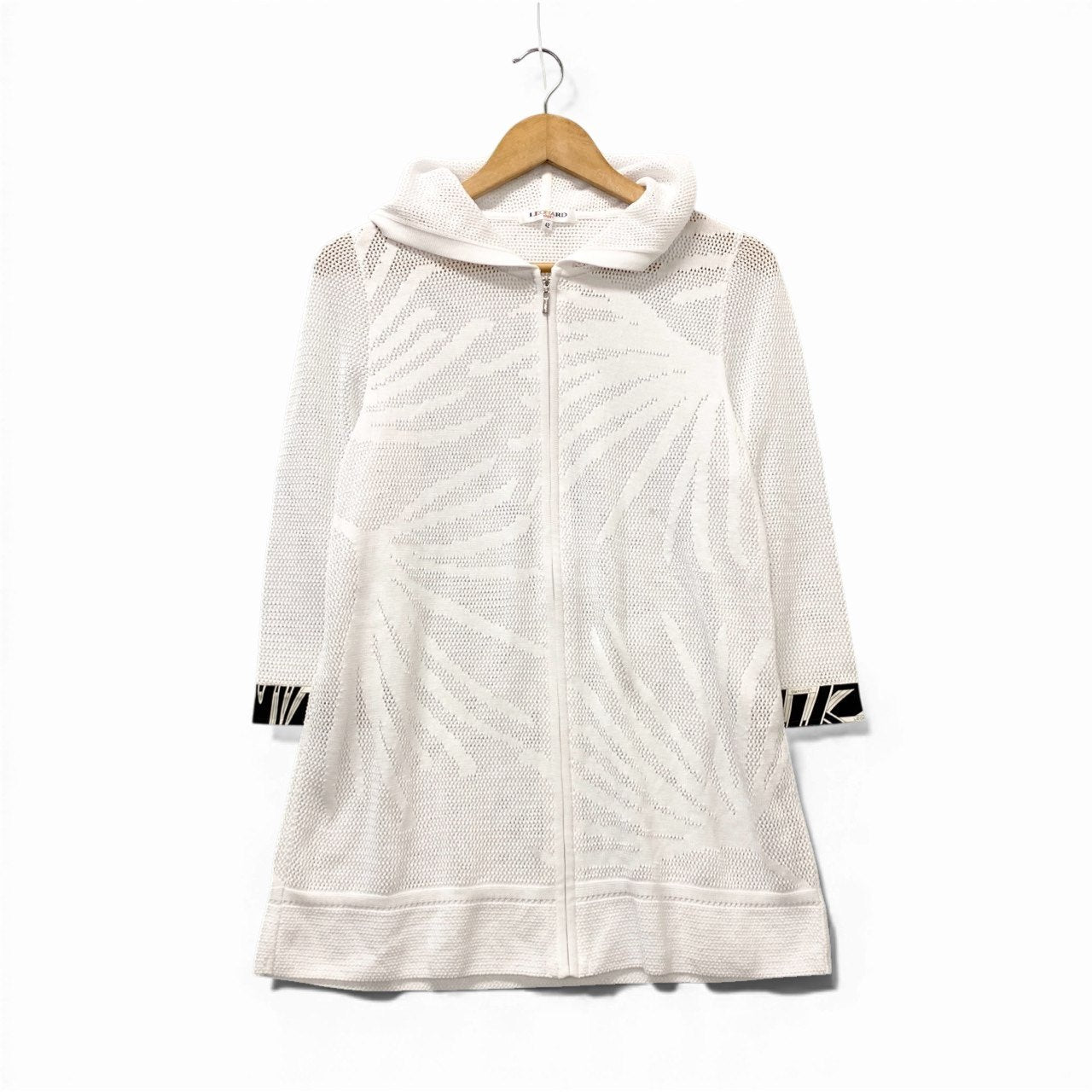 やわらかなアイボリーホワイトのニットフーディージャケットです。全体にリーフ調の編み柄が施された立体的なジャカードニットで、マットな質感が上品な印象を与えます。袖口にはブラック×ホワイトのボタニカル柄切り替えがアクセントとなり、レオナールらしい華やかさを演出。ジップアップ仕様で軽い羽織りとして春秋のデイリー使いからリゾートシーンまで幅広く活躍する一着です。