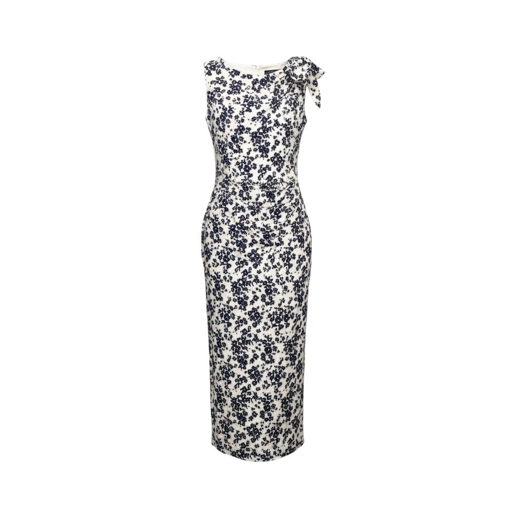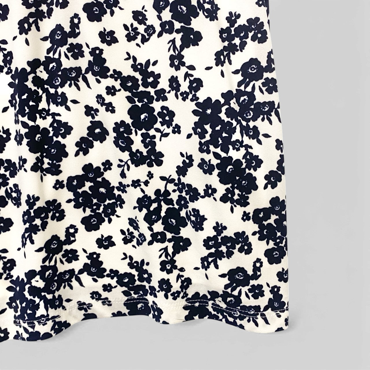 アイボリー地にミッドナイトネイビーの小花柄をあしらった、上品なフラワープリントデザイン。 なめらかで落ち感のあるポリエステル素材に、肩のドレープとリボンディテールが女性らしい印象を高めます。 ノースリーブのすっきりしたラインとロング丈のバランスが、リゾートからパーティーシーンまで幅広く活躍。 一枚で華やかさを演出できる、ローレン ラルフローレンらしいエレガントなドレスワンピースです。