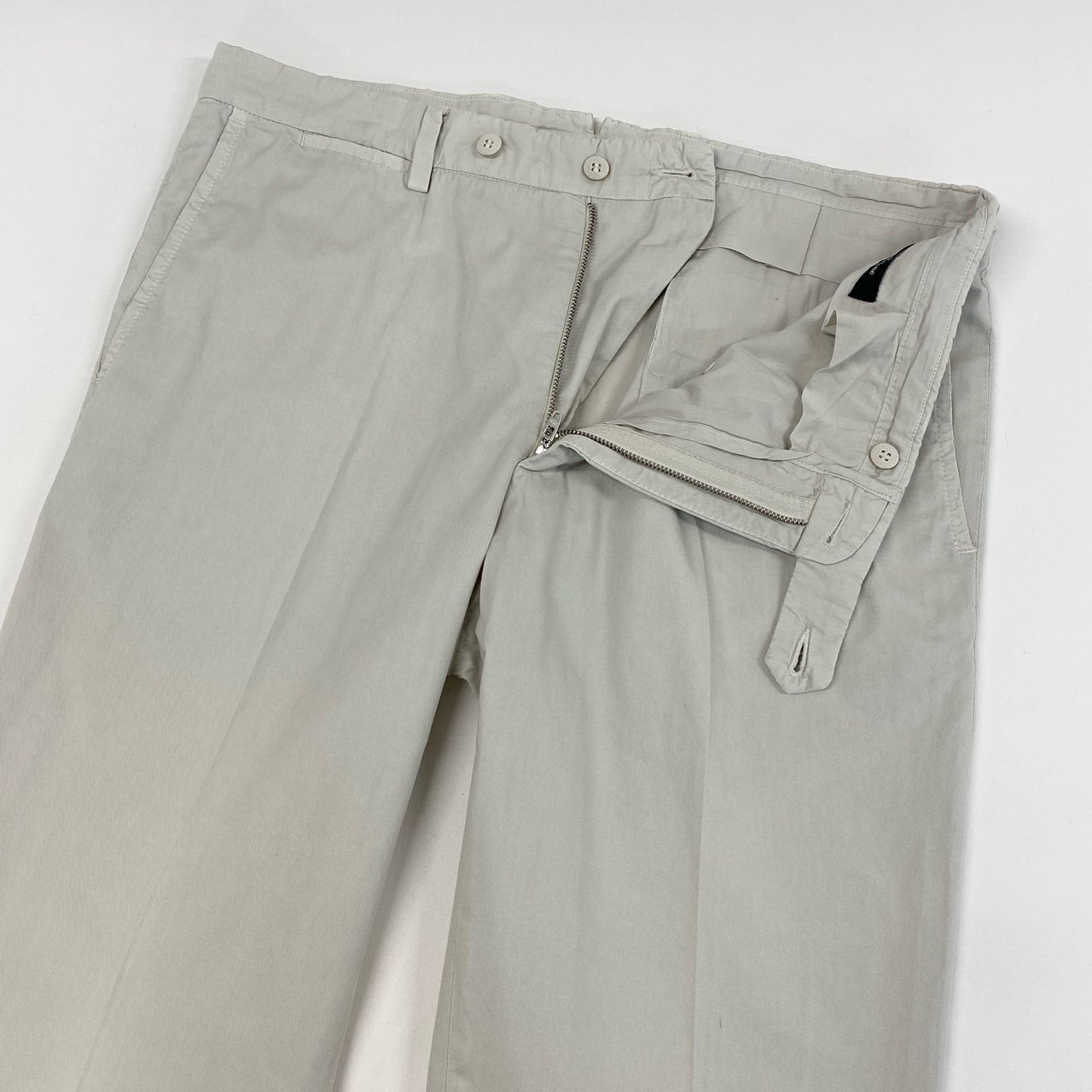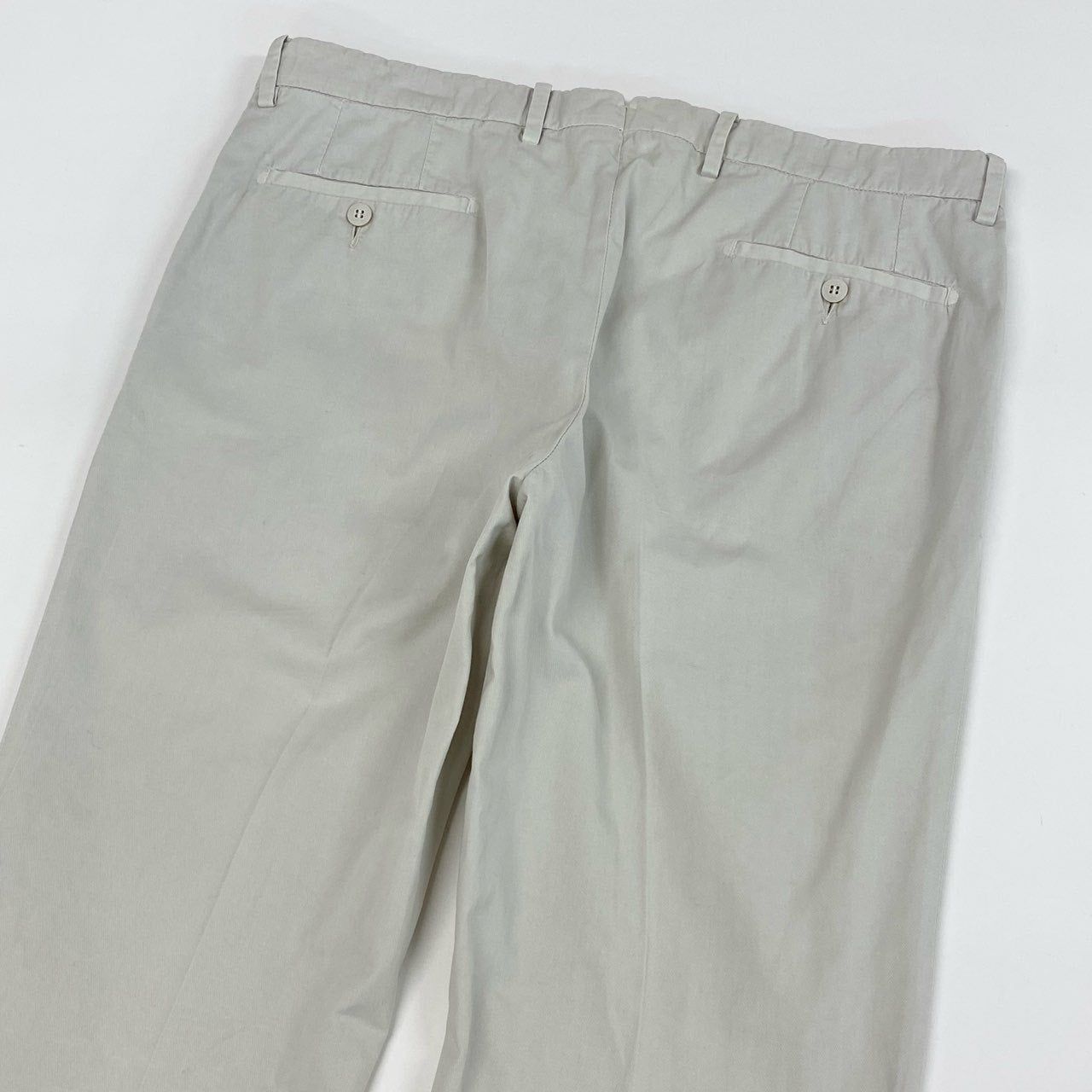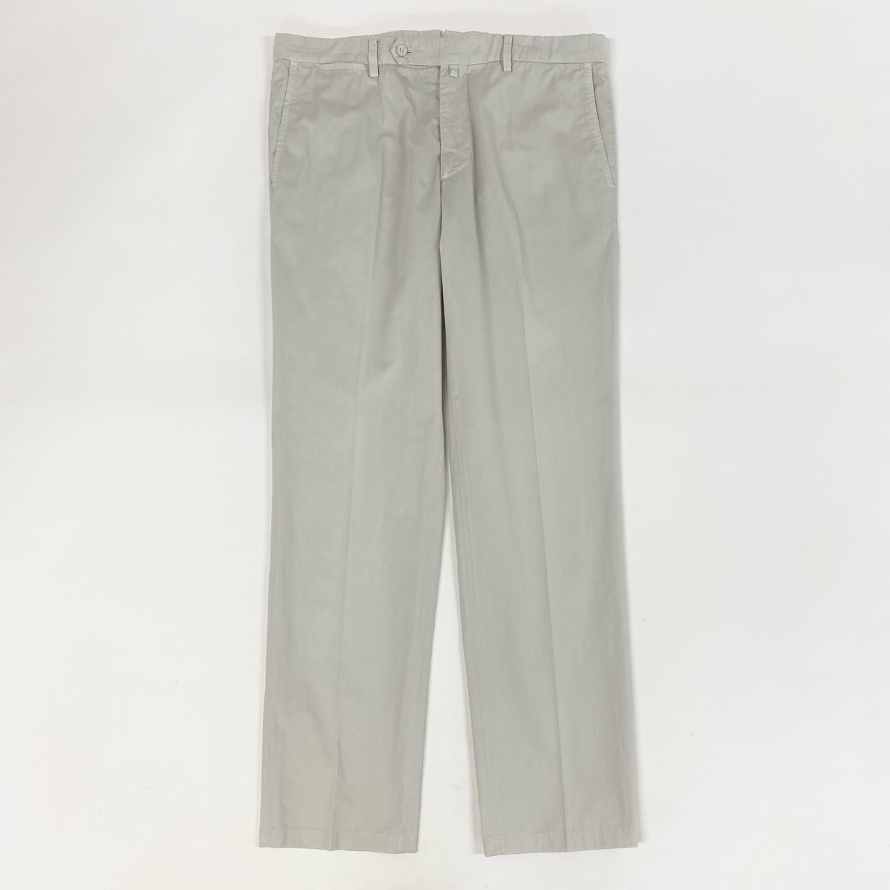 Kiton(キートン)のコットンパンツ、ライトベージュの上品で洗練された一本です。無地のシンプルなデザインながら、美しいシルエットと高級感のあるコットン素材で、ドレスからカジュアルまで幅広く対応可能。センタープレス入りで脚長効果があり、ジャケットスタイルにも相性抜群です。上質な仕立てと着心地で、大人のワードローブに最適なチノトラウザーです。