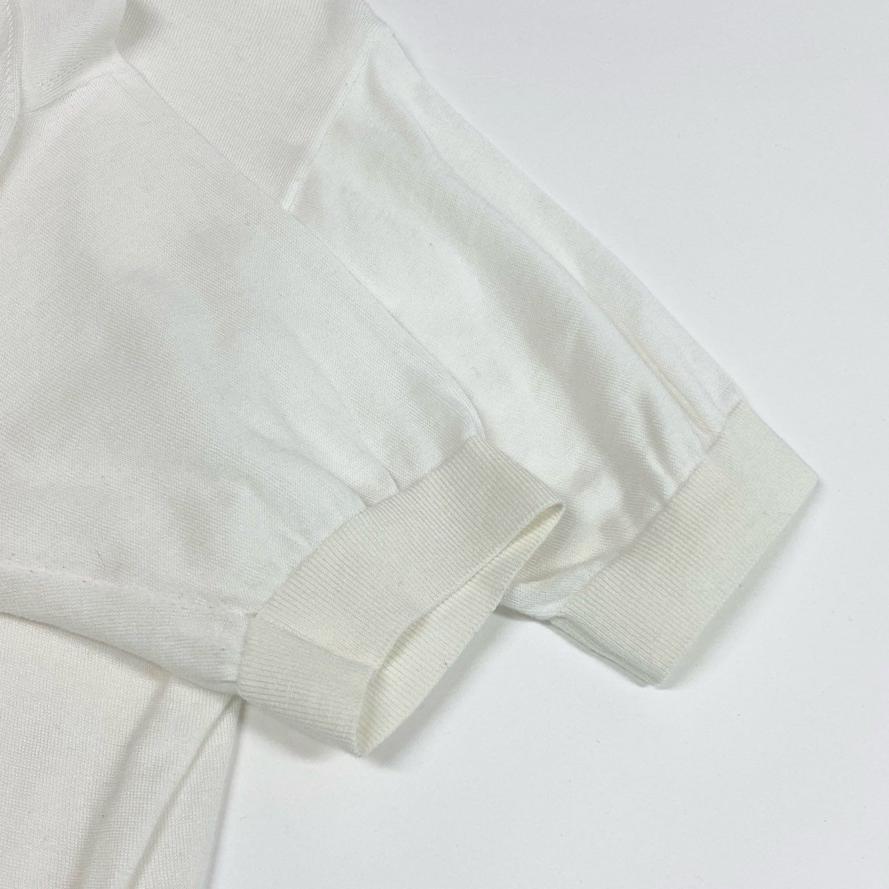 上品なアイボリーカラーが印象的な、クリスチャンディオールの半袖サマーニットです。マットで滑らかなニット素材感に、胸元の立体感あるエンブレム刺繍がさりげない高級感を演出します。袖口はややパフ感のあるデザインで、フェミニンさとクラシックな雰囲気を両立。デニムやスカートにも合わせやすく、デイリーからきれいめなお出かけまで幅広く活躍する一着です。