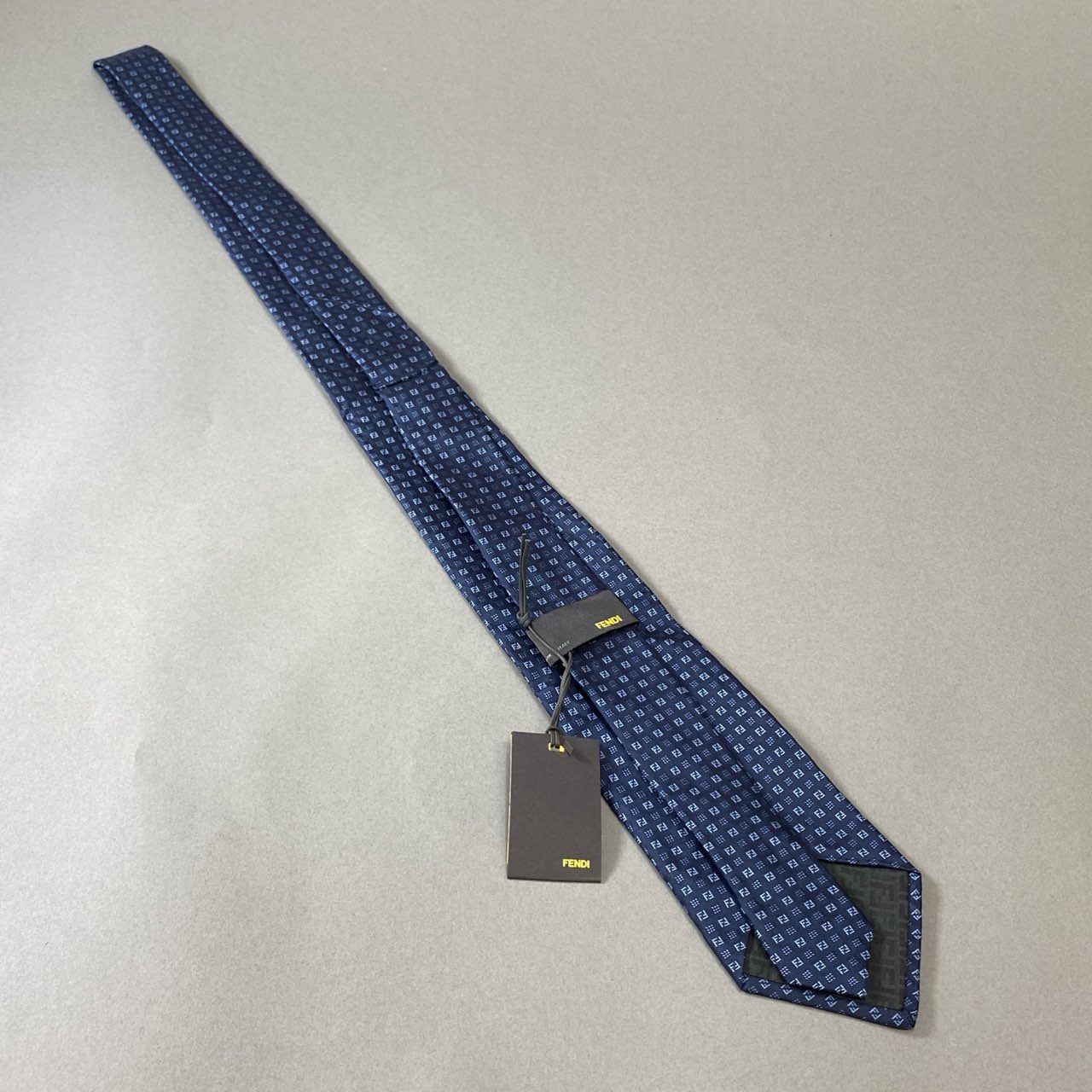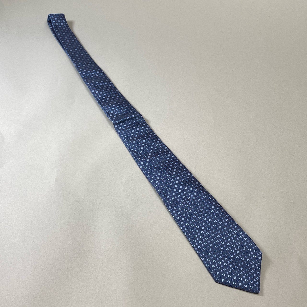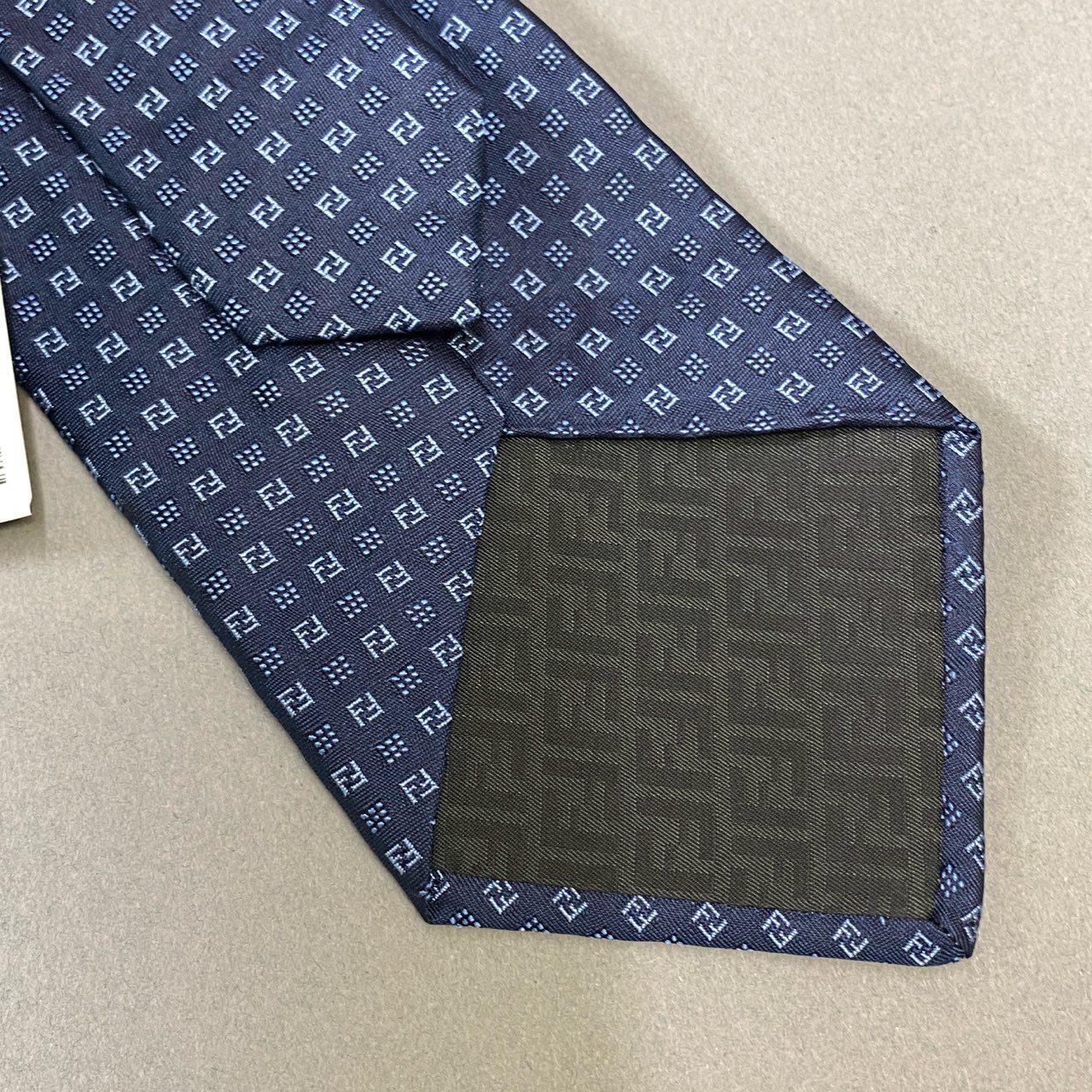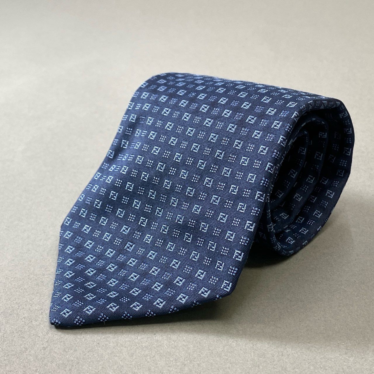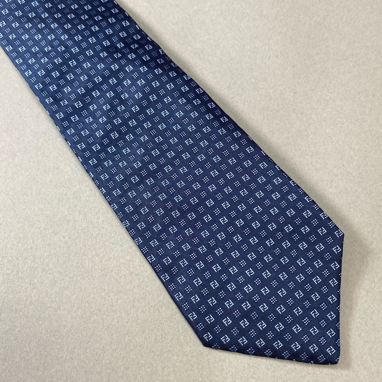 フェンディのFFロゴが織り込まれたネイビーのシルクネクタイ。小紋風の総柄デザインがさりげなくブランドらしさを主張し、控えめながらも高級感ある仕上がりです。光沢のあるシルク生地がスーツスタイルを格上げし、ビジネスシーンやフォーマルな席にも最適。クラシックとモダンを融合した上質な一本です。