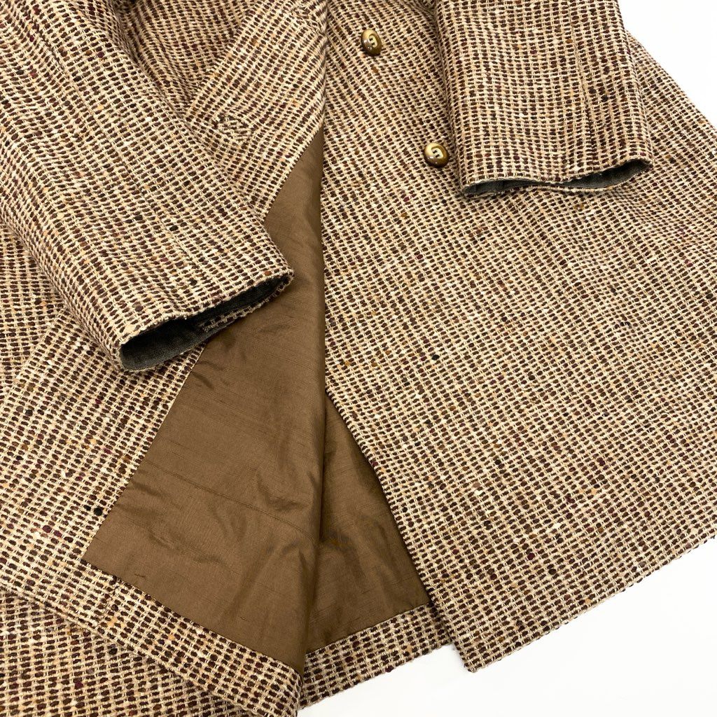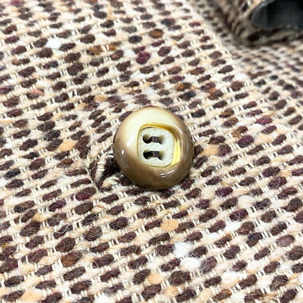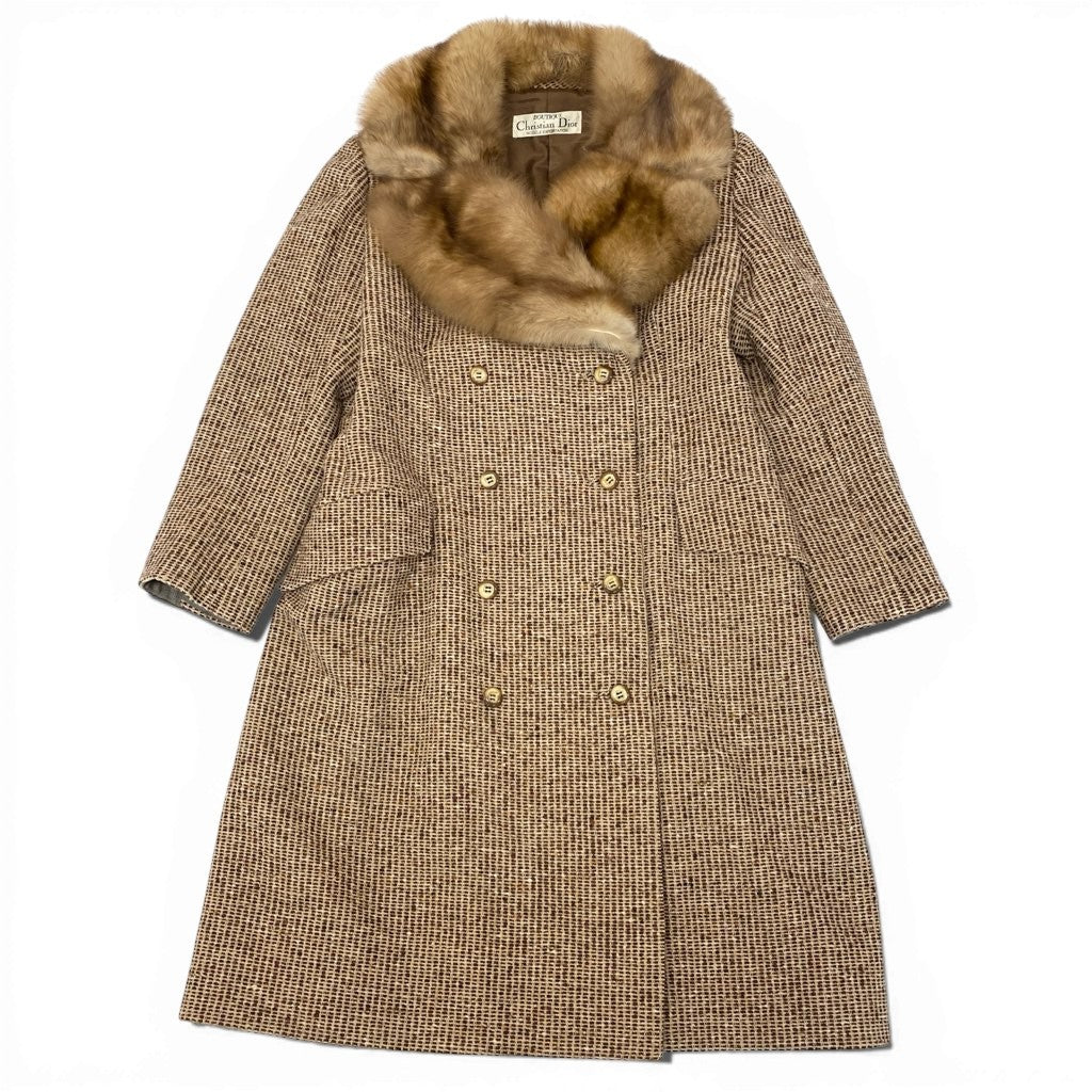 Christian Diorのクラシックな魅力が詰まったロングコートです。カラーはベージュ〜ライトブラウン系で、細かな織り柄が上品な表情を演出します。毛足のあるリアルファー襟が華やかさと高級感をプラスし、ダブルブレスト仕様とメタルボタンがエレガントな印象です。フォーマルな外出や特別なシーンはもちろん、ヴィンテージライクなコーディネートにも映える一着です。