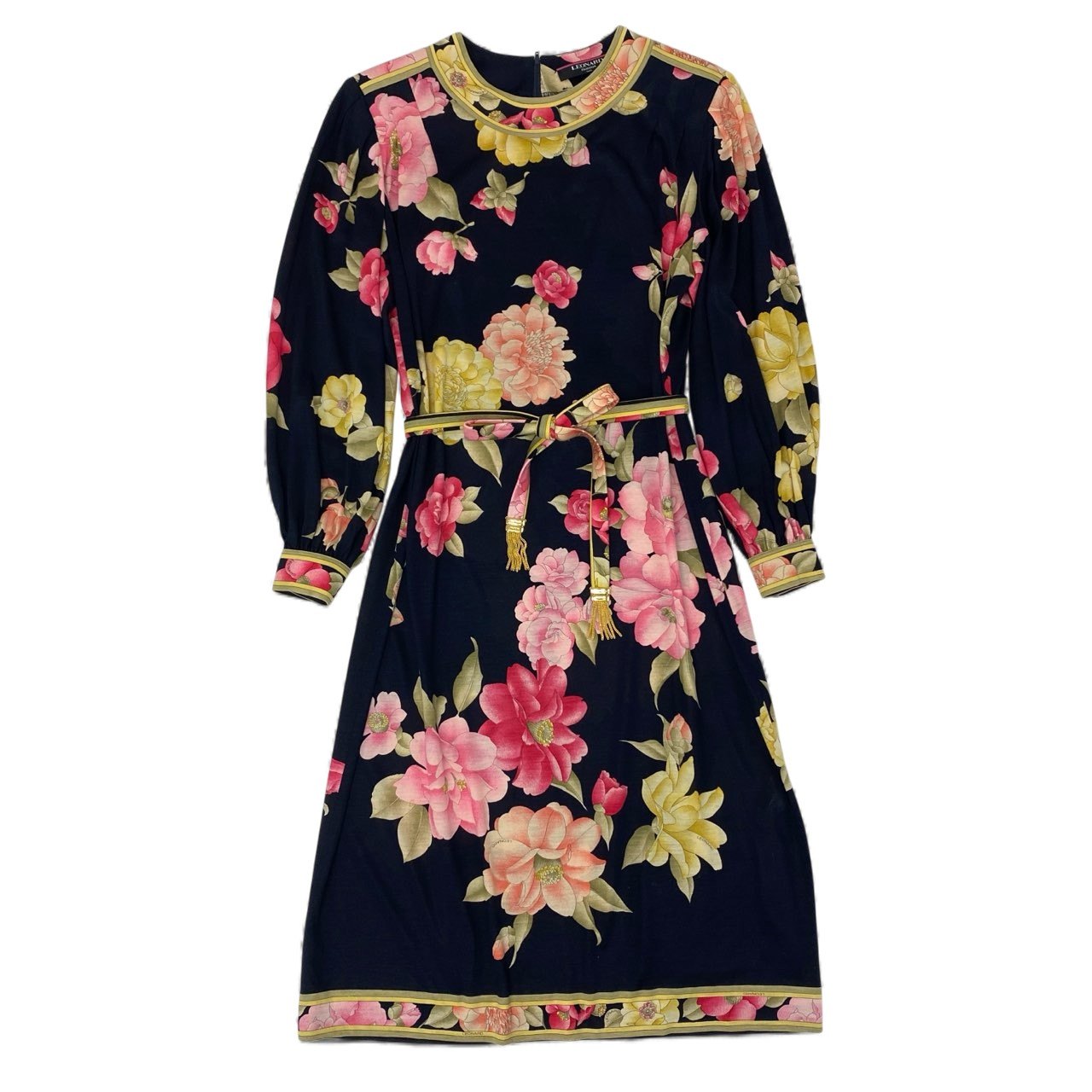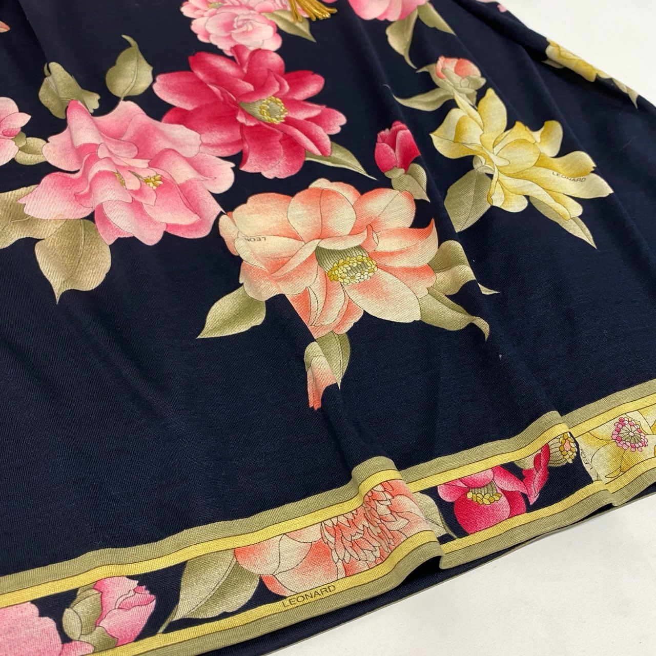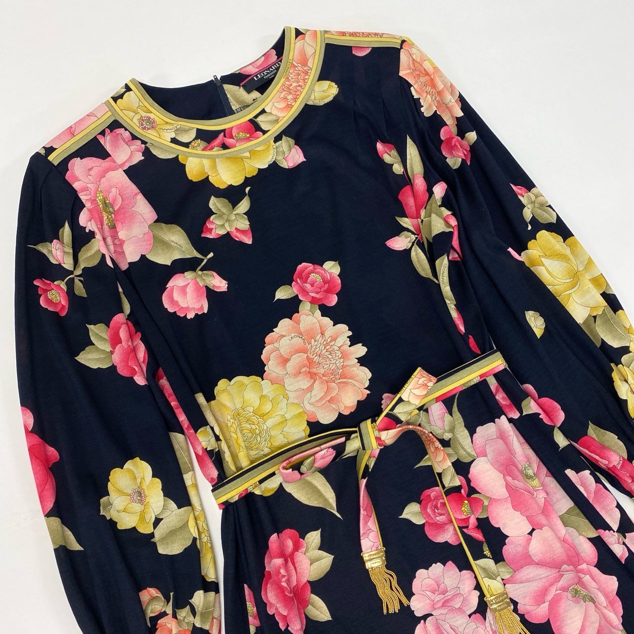 19k10 LEONARD レオナール 長袖ワンピース ロングワンピース クルーネック 花柄 0320100 Mサイズ ネイビー レディースu02t