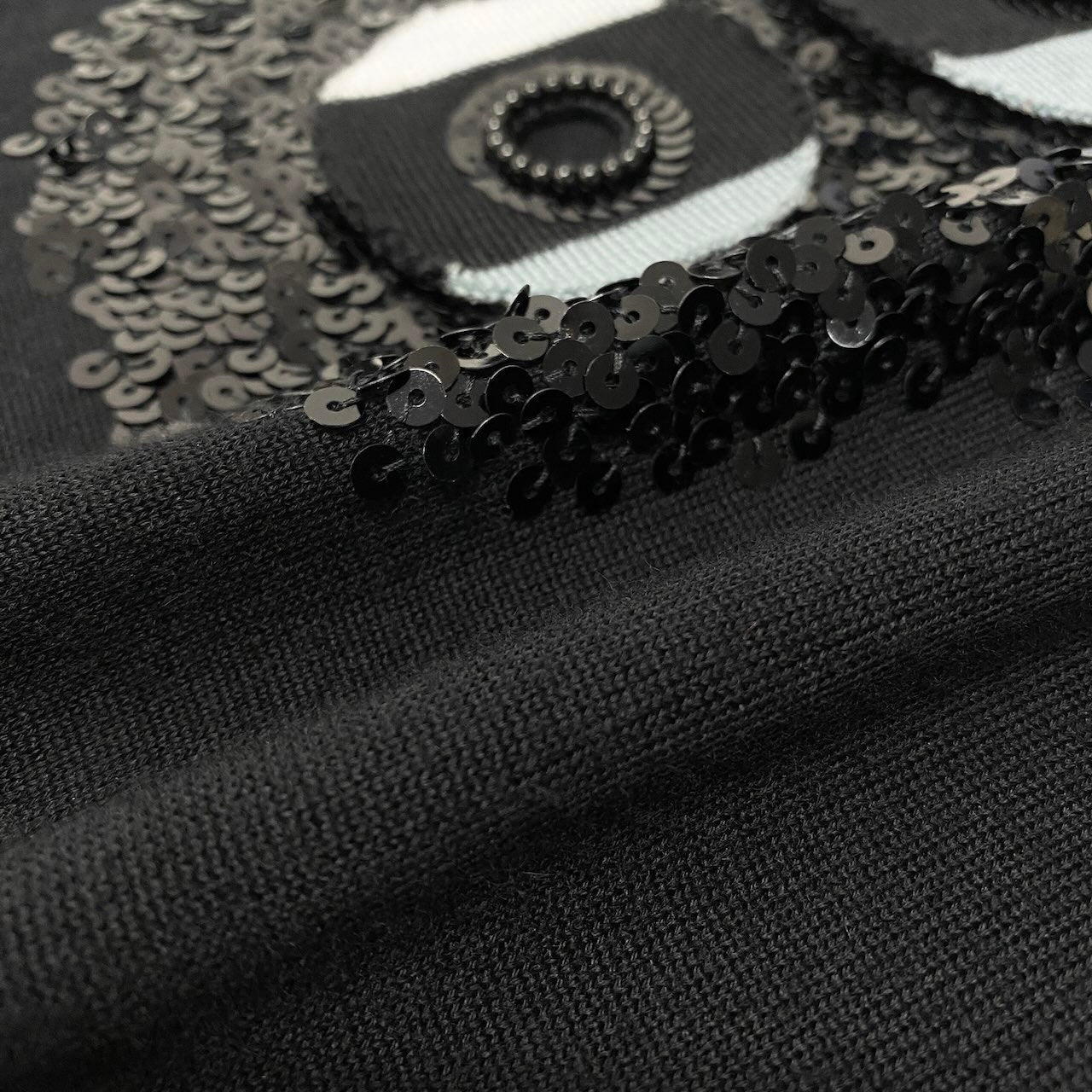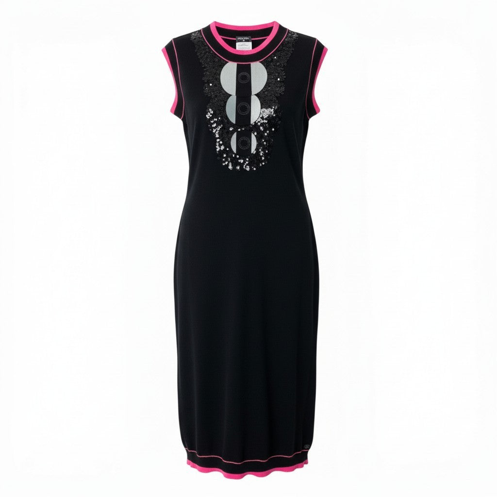 CHANELのランウェイ着用モデルで、ブラックをベースにピンクのトリミングが映えるモード感あふれる一着です。 フロントにはスパンコールと幾何学的なサークルモチーフが施され、華やかで印象的なデザインに仕上がっています。 カシミヤニットの滑らかでマットな質感が高級感と快適な着心地を両立します。 一枚で主役になる存在感があり、パーティーや特別なシーンにも映えるエレガントなワンピースです。
