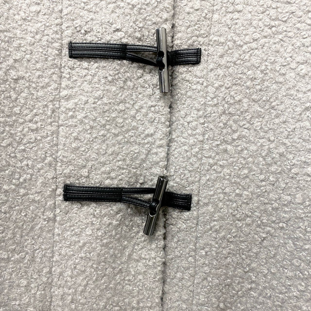 落ち着いたライトグレー(メランジグレー系)のダッフルコートです。毛足のある立体的なブークレ調ウール素材が暖かみと上質感を演出。ブラックのトグルボタンと大きめフラップポケットがアクセントになり、シンプルながら洗練された印象です。フード付きのロングシルエットで、防寒性とスタイルアップを両立。冬のデイリーコーデや通勤スタイルにも活躍する一着です。